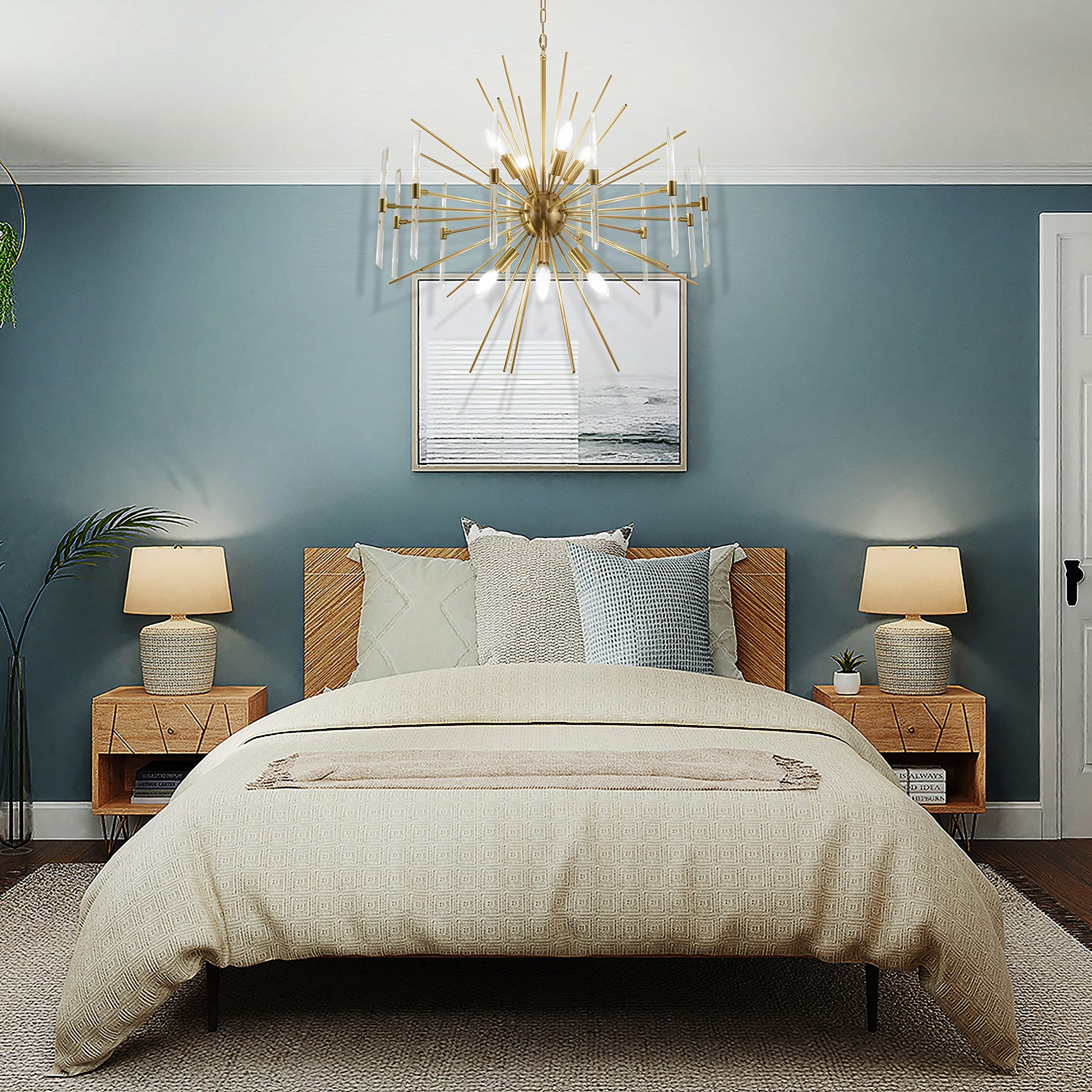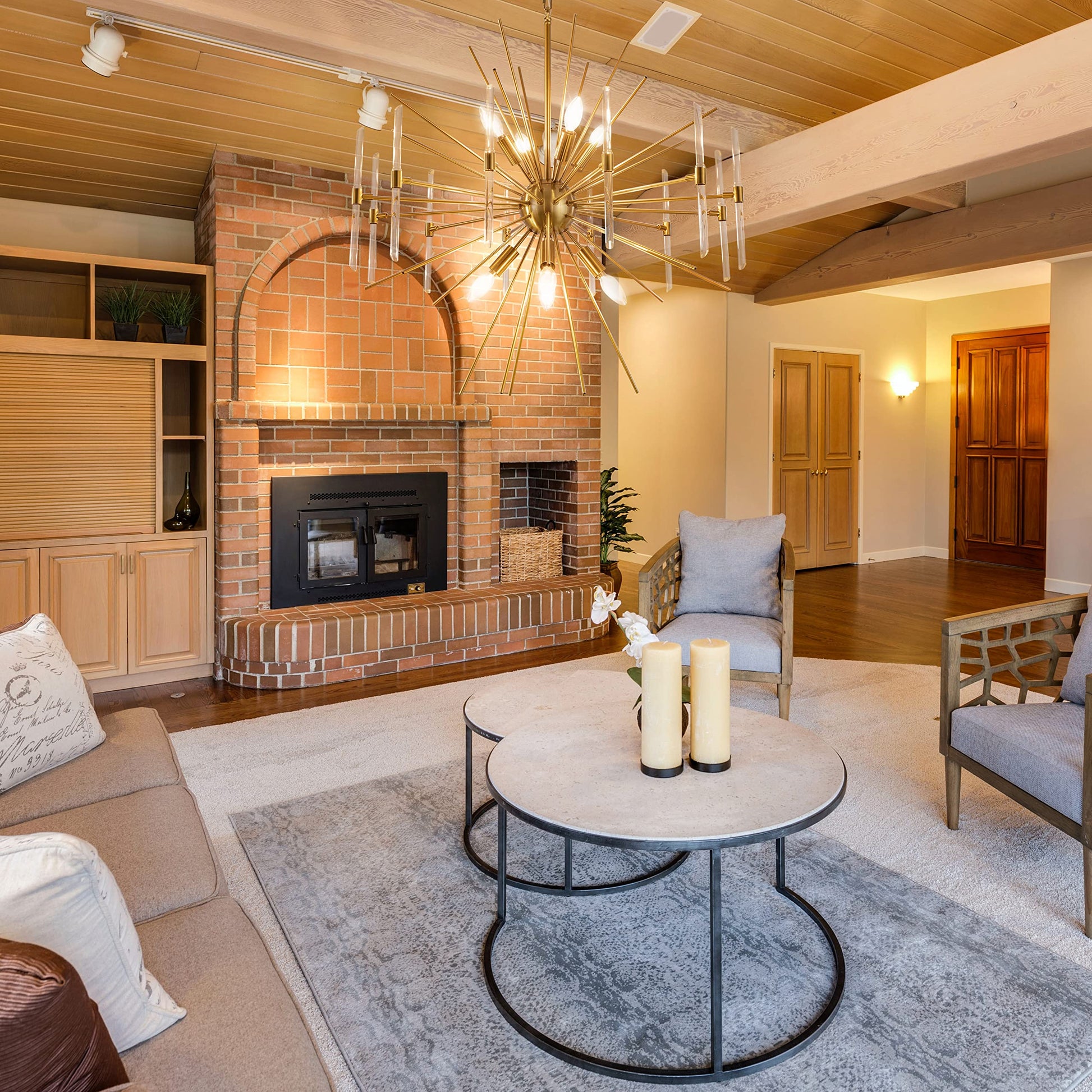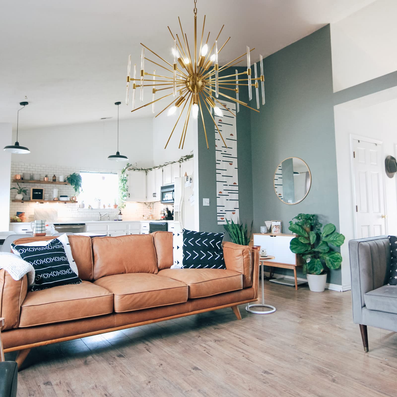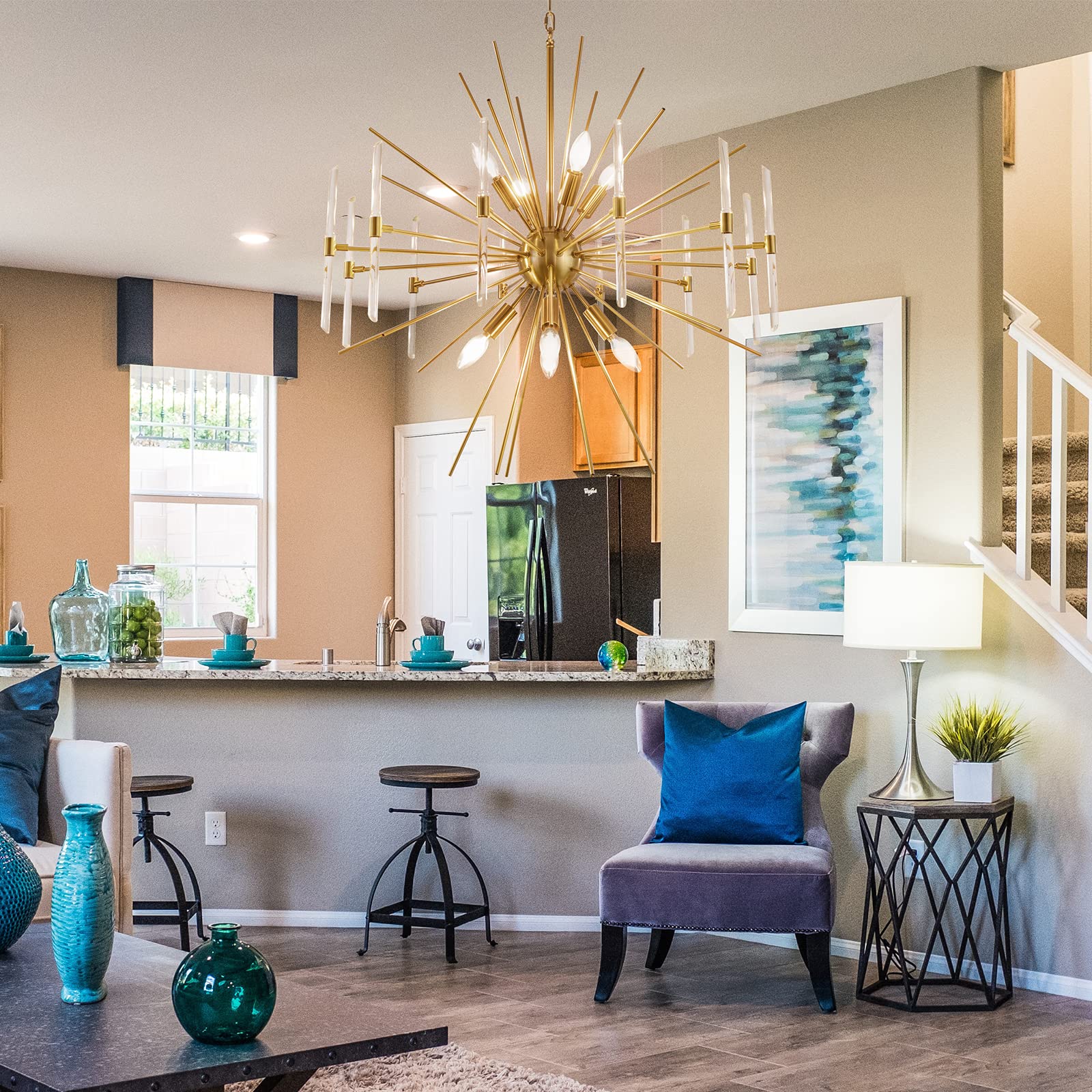 - This Sputnik chandelier is compatible with 8*E12 base bulbs for illuminating, the bulb is arranged equally with several angles. It offers ample lighting for large spaces. It can brighten up a living room, dining room, or bedroom with ease, and its unique design ensures that it doesn't overpower the room.