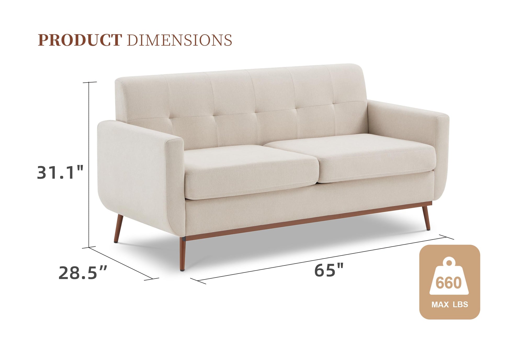 - Lasting & Durable The surface of the couch is made of linen fabric that is not easy to wear and tear. The solid wood frame of the couches for living room and the reinforced support in the seat and backrest ensure comfort without deformation and sinking. The max weight capacity is 500 LBS. And, the sturdy metal feet make the small couch not easy to shake, safe and stable. Every detail of the sofas exudes nobility and quality, because what we offer you more a long-lasting guarantee!