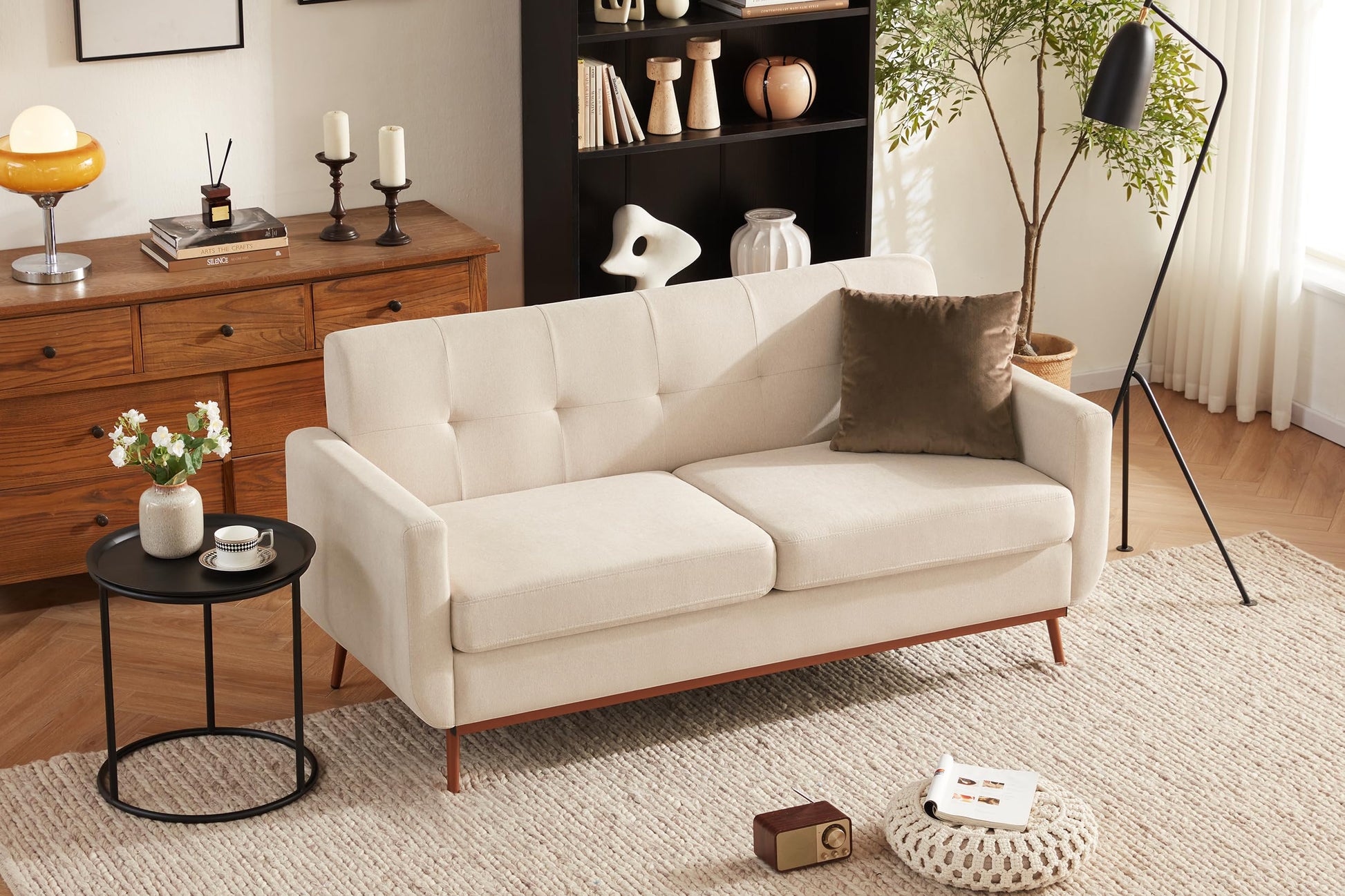 - Classic Mid-Century Style The mid century modern couch combines elegant silhouettes with tufted back accents and refined details to display unique taste and elegance. More than just furniture, this mid century modern sofa is a work of art that complements a wide range of interior styles. Choose the loveseat to give your home a new charm and revisit mid-century classics with modern chic!