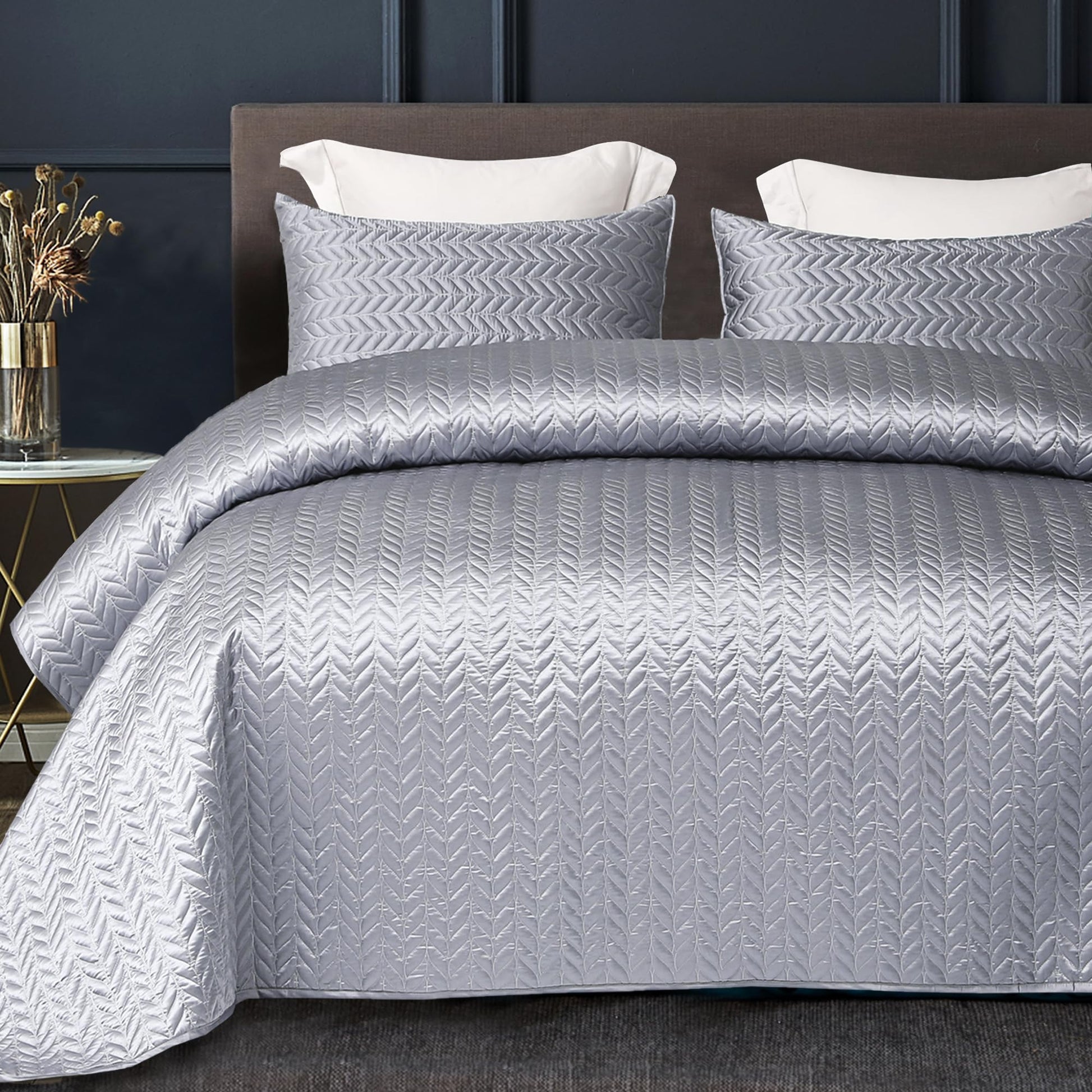 - Unique design: This ultra comfortable bedding set is double-side design. Top side of the coverlet is pure satin fabric quilted with leaf patterns, reflecting charming pearly lustre in the light. The other side is made of brushed fabric, which makes the bedspread more breathable and long lasting than cotton fabric. You could choose both side to cover as you like