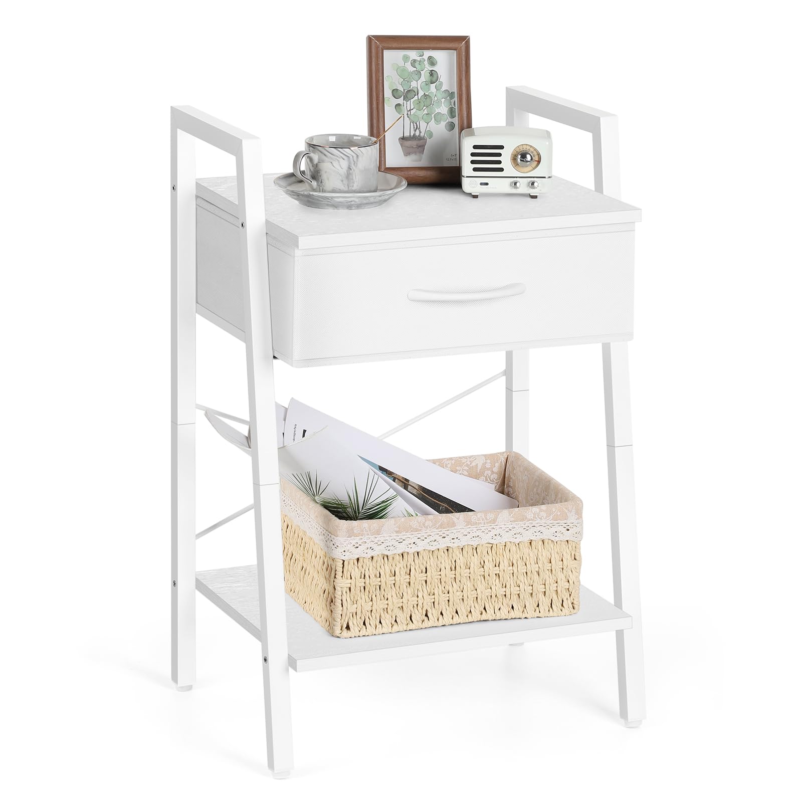 - This white bedside table includes two open shelves and a fabric drawer to ensure plenty of space for worry-free storage. Whether it's books, cell phones or other small items, they can be easily stored to keep your bedroom neat and organized.