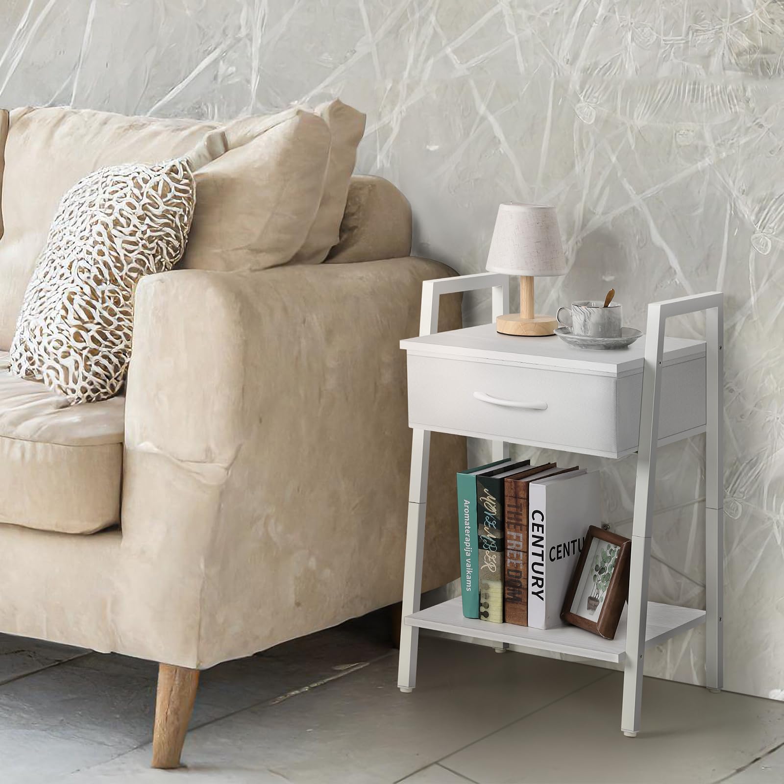 - Open storage shelves and hidden storage areas with drawers keep your personal items organized. This white end table with drawer is not only great for storage, but also a piece of art that enhances the overall style of the room. Perfect for bedrooms, dormitories, living rooms, etc.