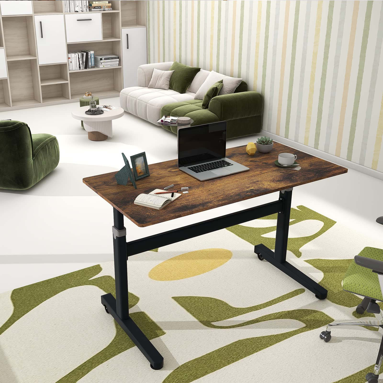 Manual Standing Desk Adjustable Height- Crank Mobile Standing Desk 48 x 24 Inches Sit Stand Desk Frame & Top, Stand Up Desk on Wheels, Computer Desk Black Frame & Rustic Brown