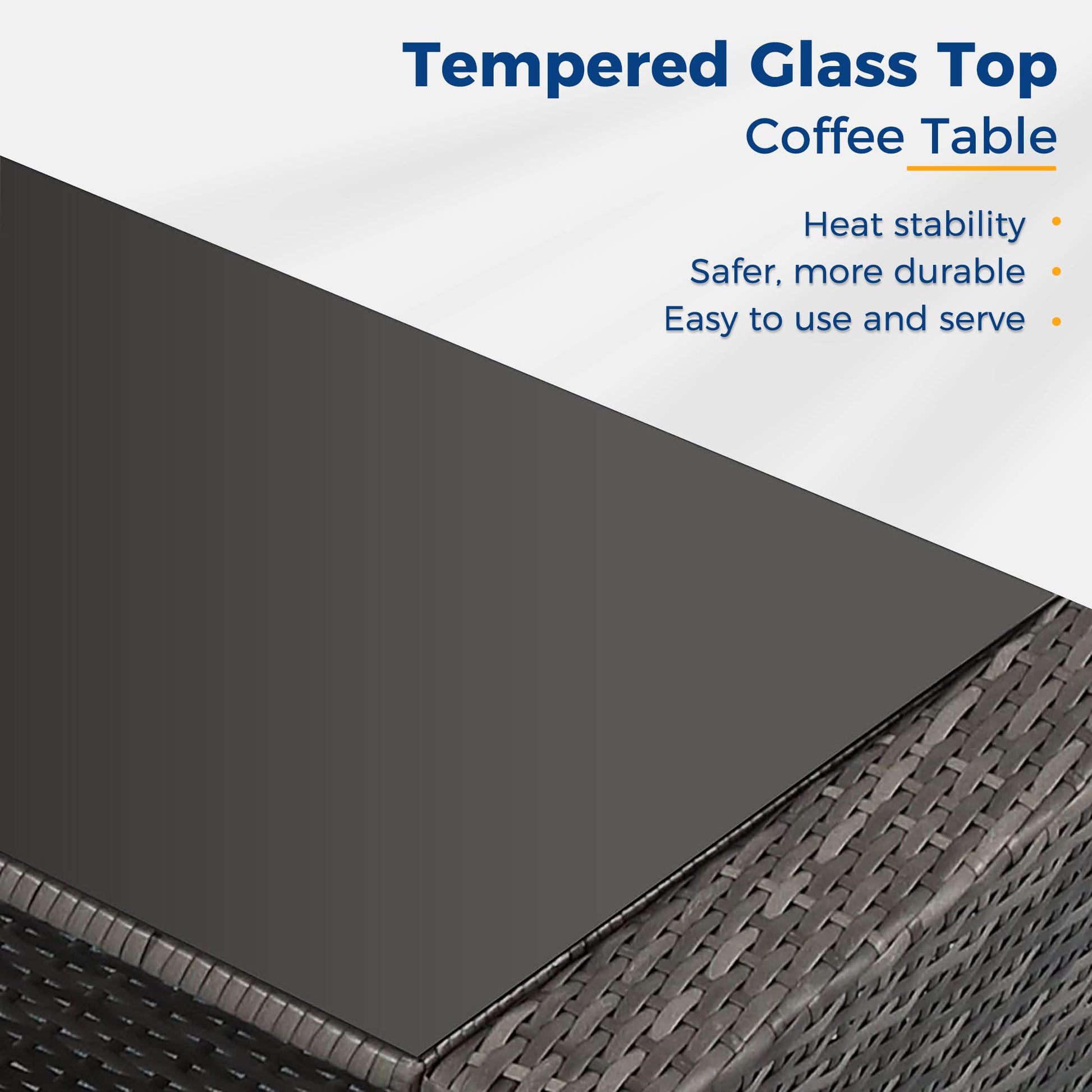 - Easy to Maintain Cleaning and maintaining this patio furniture set is a breeze. The cushion covers can be easily removed with the zipper design, allowing for convenient cleaning. The splash-proof material ensures hassle-free maintenance. Additionally, the tempered glass top of the coffee table can be cleaned by simply soaking a towel in fresh water. For tough stains, soak the towel in water at 100°F for effective cleaning.