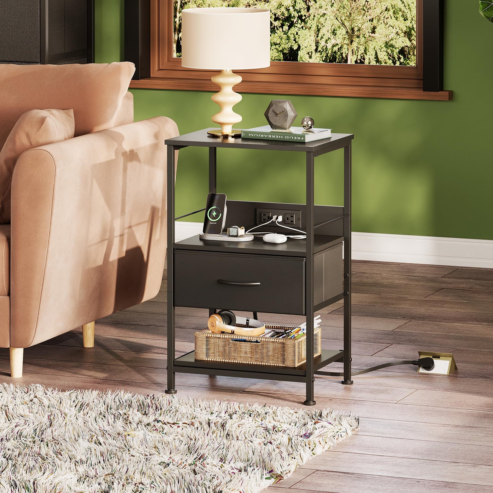 - This black nightstand includes 1 fabric drawer that provide ample storage while maintaining your privacy. The open shelves are perfect for displaying a lamp or books, adding a decorative touch to your room. With this functional bedroom furniture and charging station, you'll keep your essentials within easy reach.