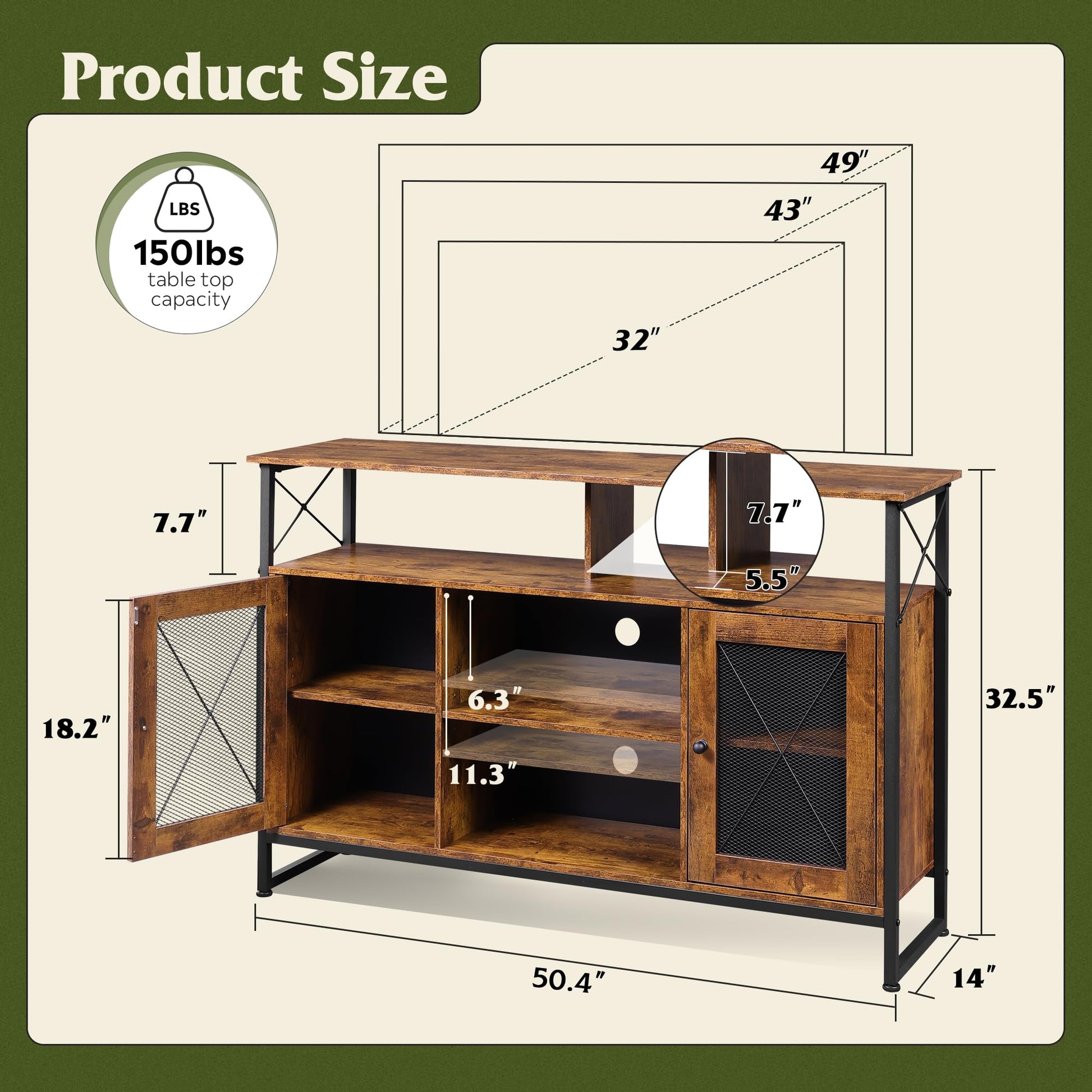 - Not Wobble& High Weight Capacity The entertainment center with steel frame legs give you the extra stability and sturdiness, the maximum load capacity of 150 pounds and measures 50.4" W x 14" D x 32.5" H. This TV stand is suitable for 43/50/55 inch TV.
