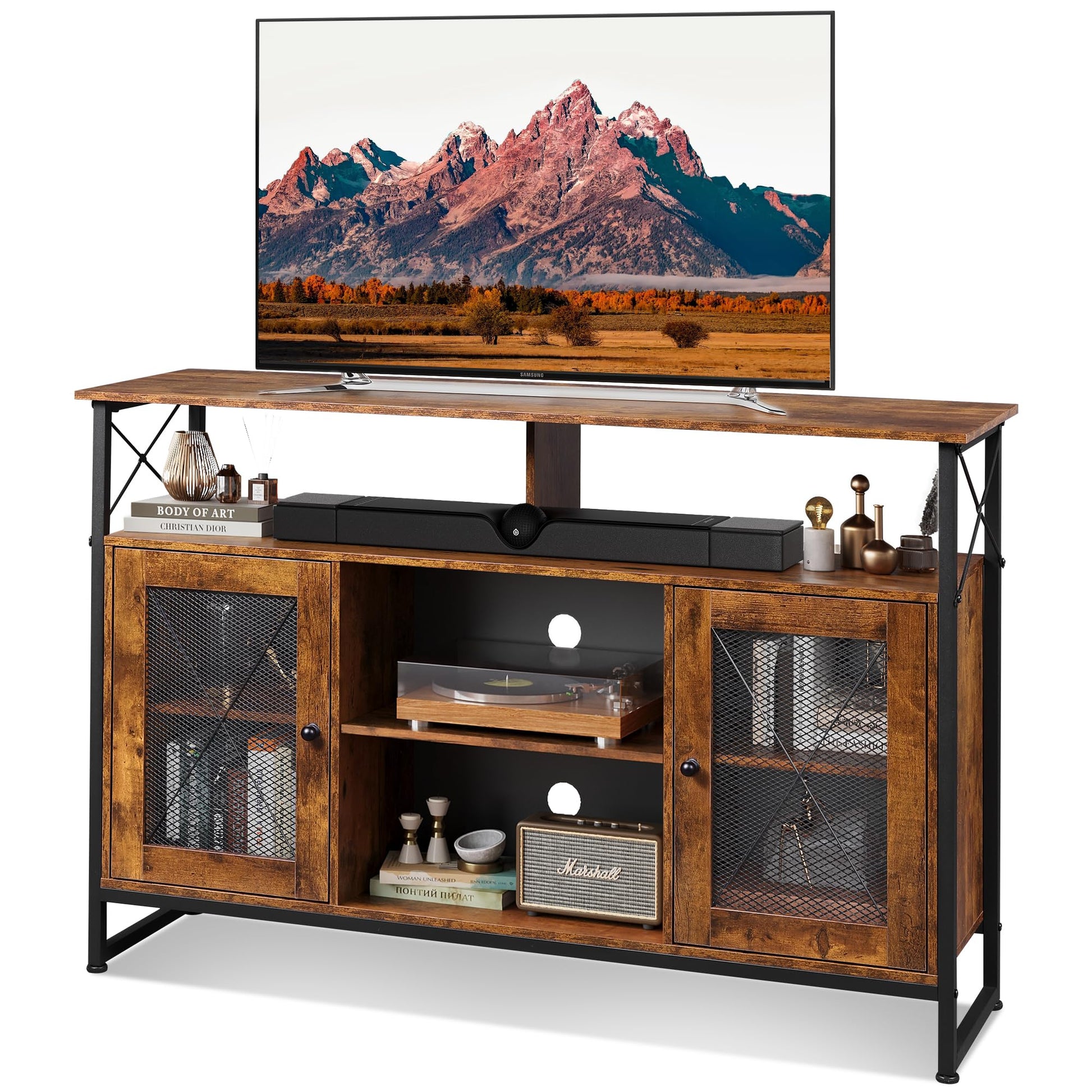 - Tall TV Stand with Storage Top Semi-open shelf for sound bar storage. two industrial-inspired mesh doors on either end opens to give you an ample space to display your DVDs and board games, while the central shelves are ideal for media players and consoles.
