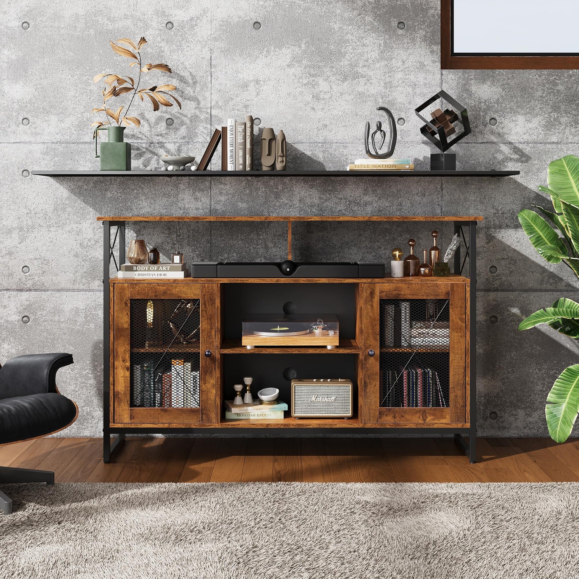 - Farmhouse Entertainment Center Beautiful wood grain and black metal frame flawlessly combined with modern and traditional style. Clean lines fuse with industrial flair to give this entertainment center a farmhouse appearance that adds an on-trend touch to your room. It is perfects that blends seamlessly with your other home furniture and offers all the functional features you need.