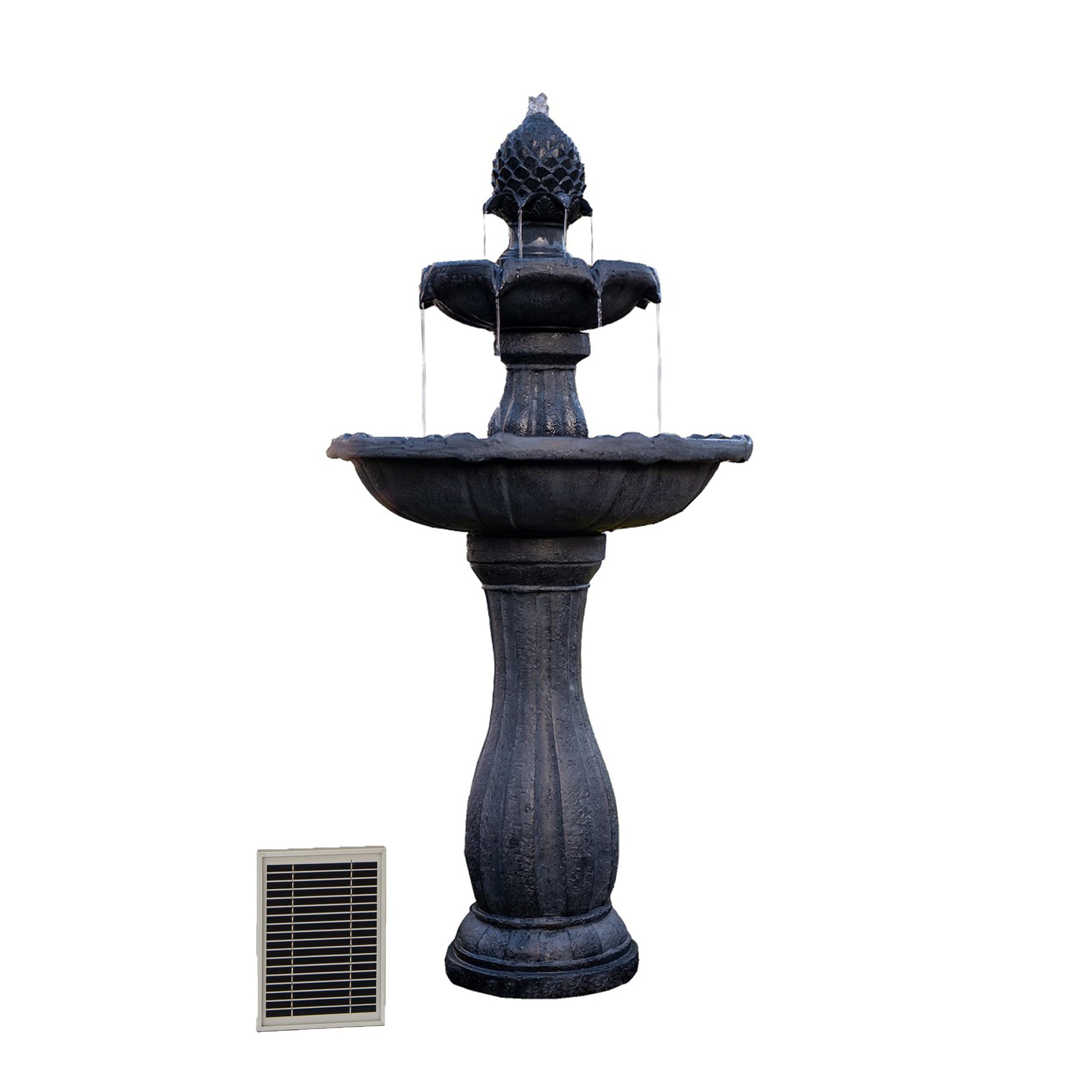44" Tall Black Fiberglass/Resin 2-Tiered Solar Water Fountain w/Solar Panel and Auto-Shut