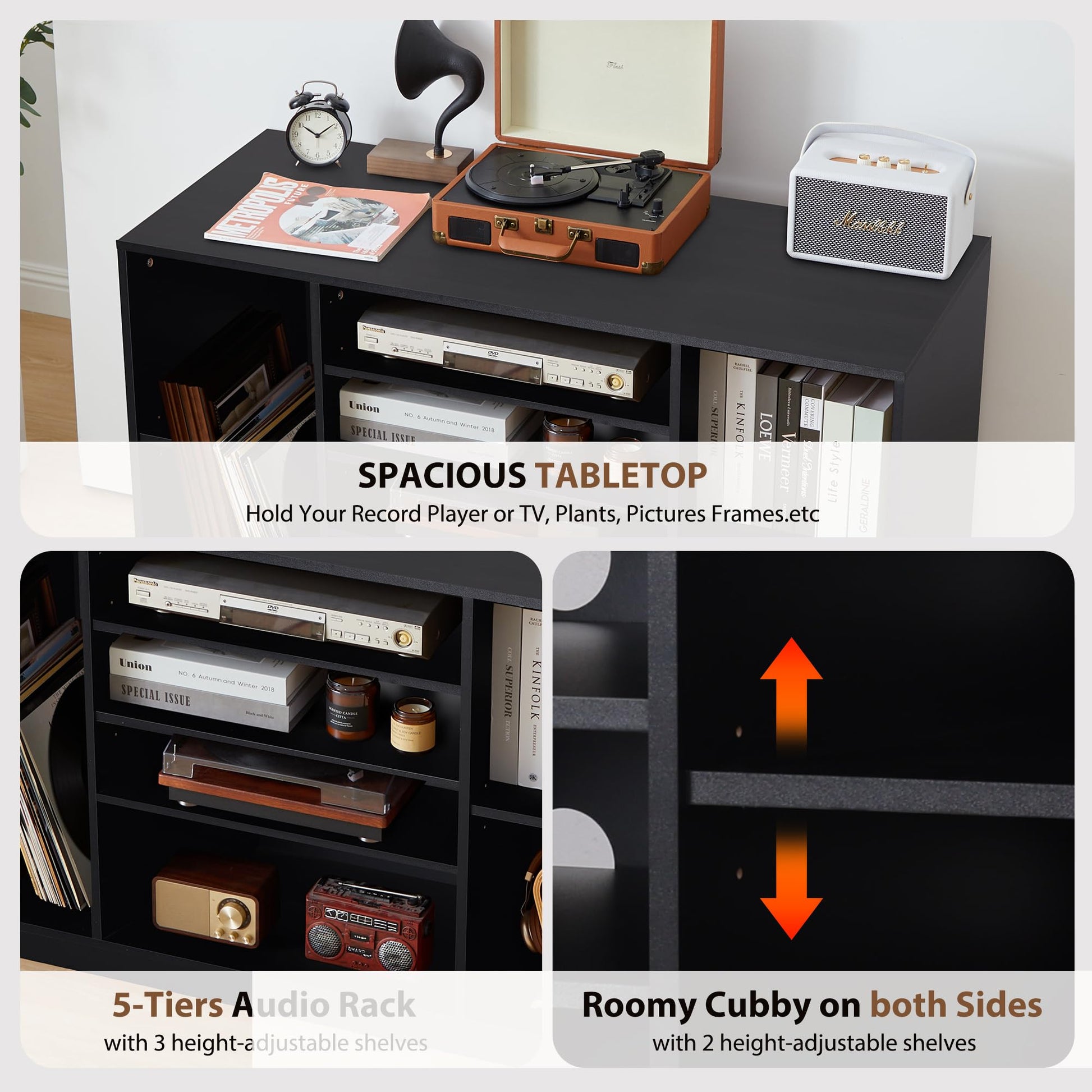 - 5-Tier Shelves Media Storage Cabinet This 5-tier audio storage media cabinet features 3 height-adjustable shelves, providing ample space to accommodate a wide range of devices such as DVD players, sound bars, TV accessories, receivers, game consoles, laptops, books, and record players. Perfect for any multimedia setup.