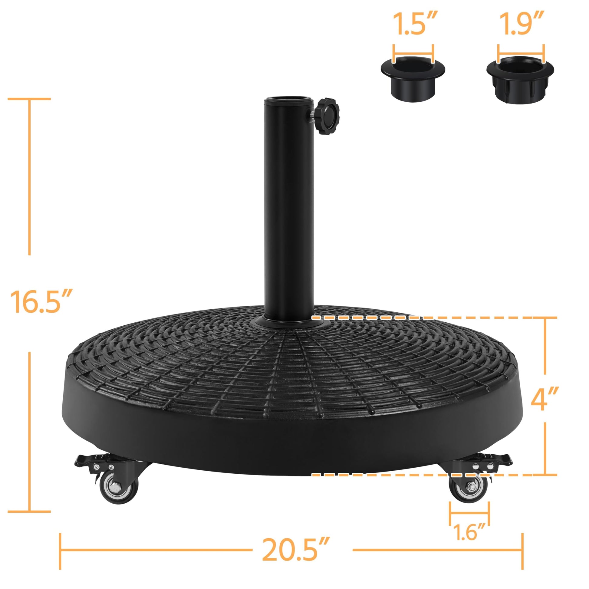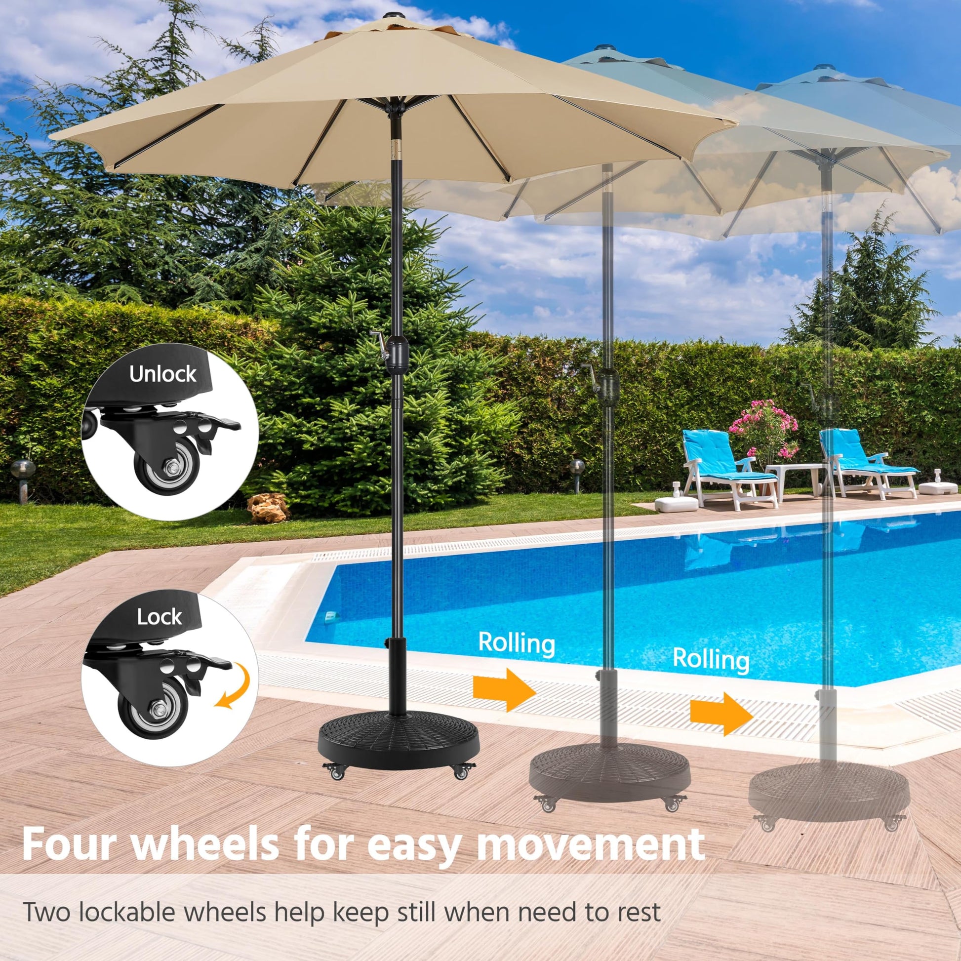 - Wheeled Base, Easy Movement Under this self-weight umbrella base arrange four industrial-grade rolling wheels, two of which are lockable, allowing you to move your outdoor umbrella where needed and keep it stable after locking the wheels while saving you from painful storage and carrying between seasons