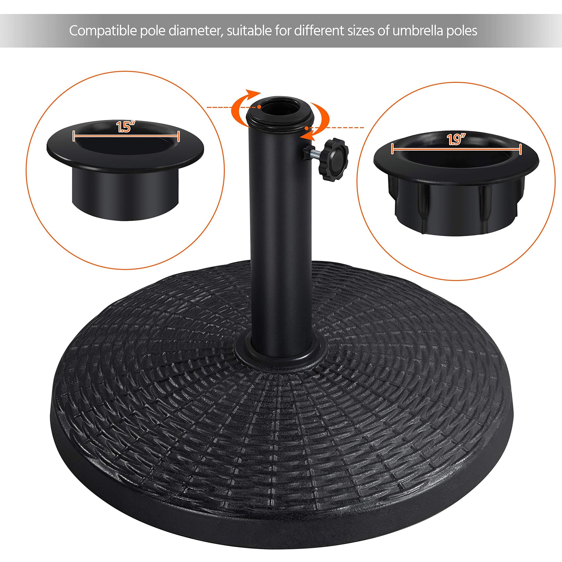 - Market standard base: This patio umbrella base stand is equipped with rubber adapters that fit the market standard umbrella pole diameter:3.8cm/1.5’’, 4.8cm/1.9’’. It can fit into most patio umbrellas with more choices.