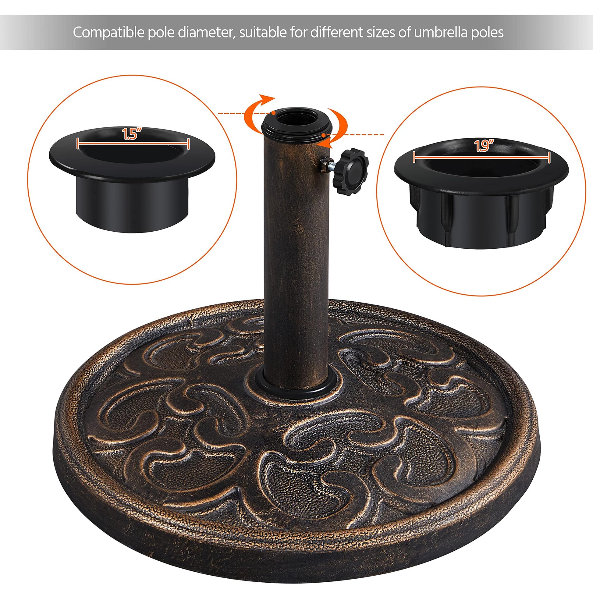- Rotary knob: There is a rotary knob on the side of the center pole to settle the patio umbrella on this base stand, by simply turning the knob left and right, the patio umbrella can be fixed or detached from this outdoor umbrella base stand.