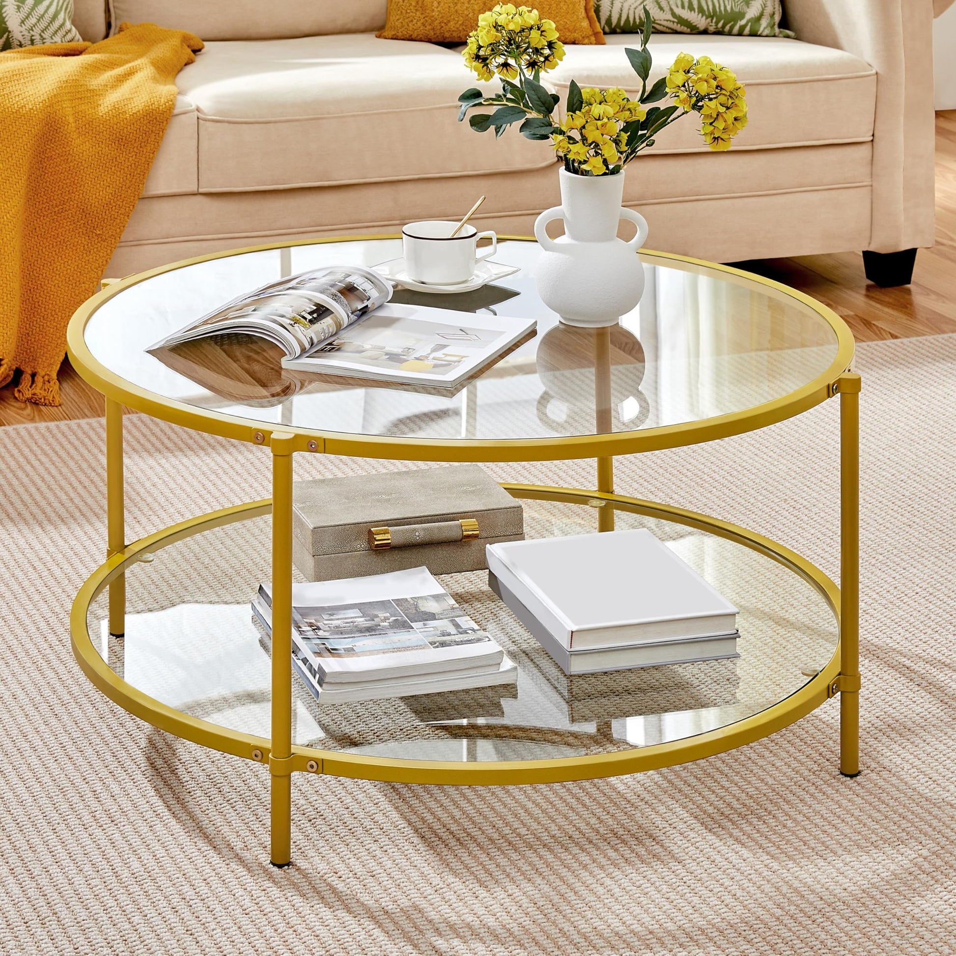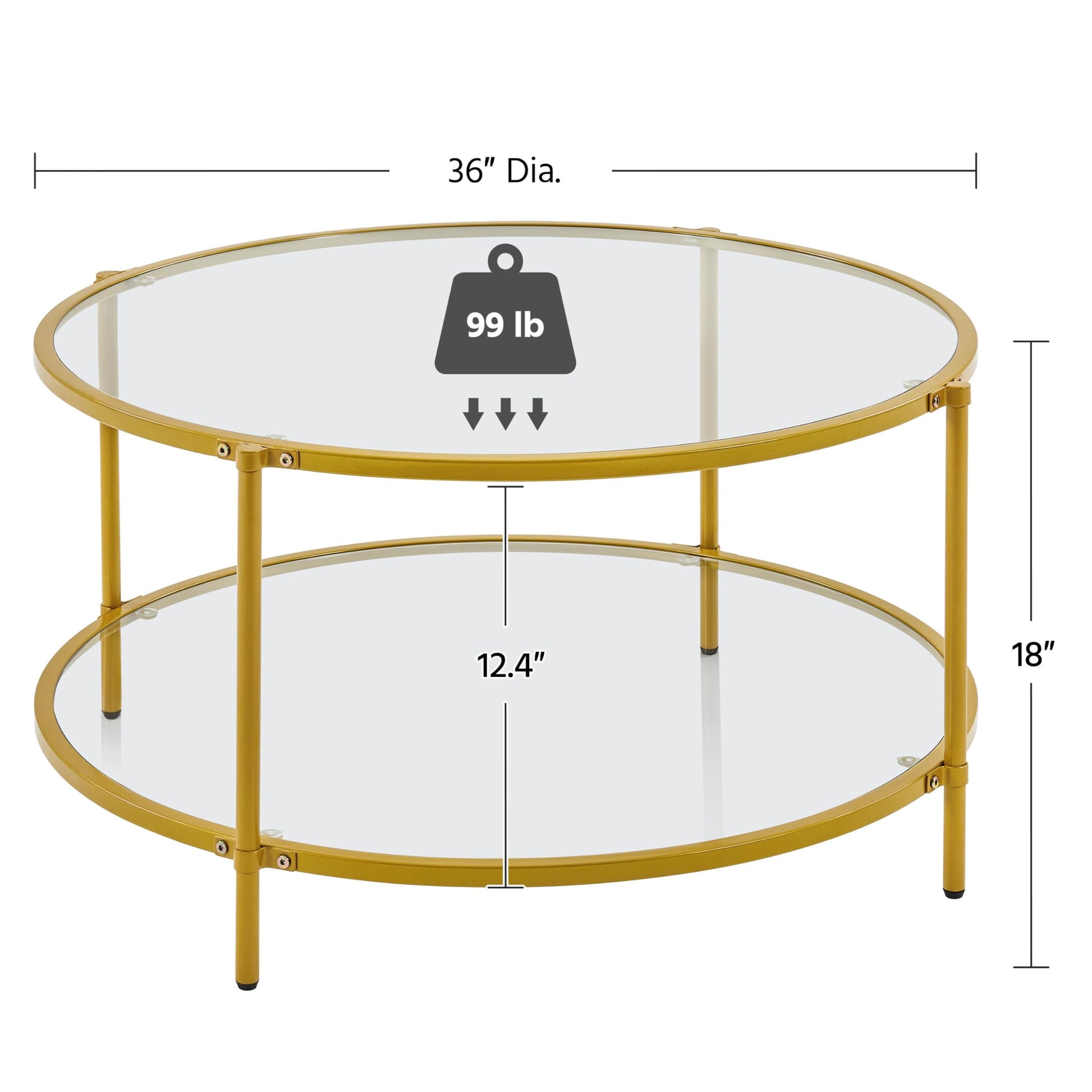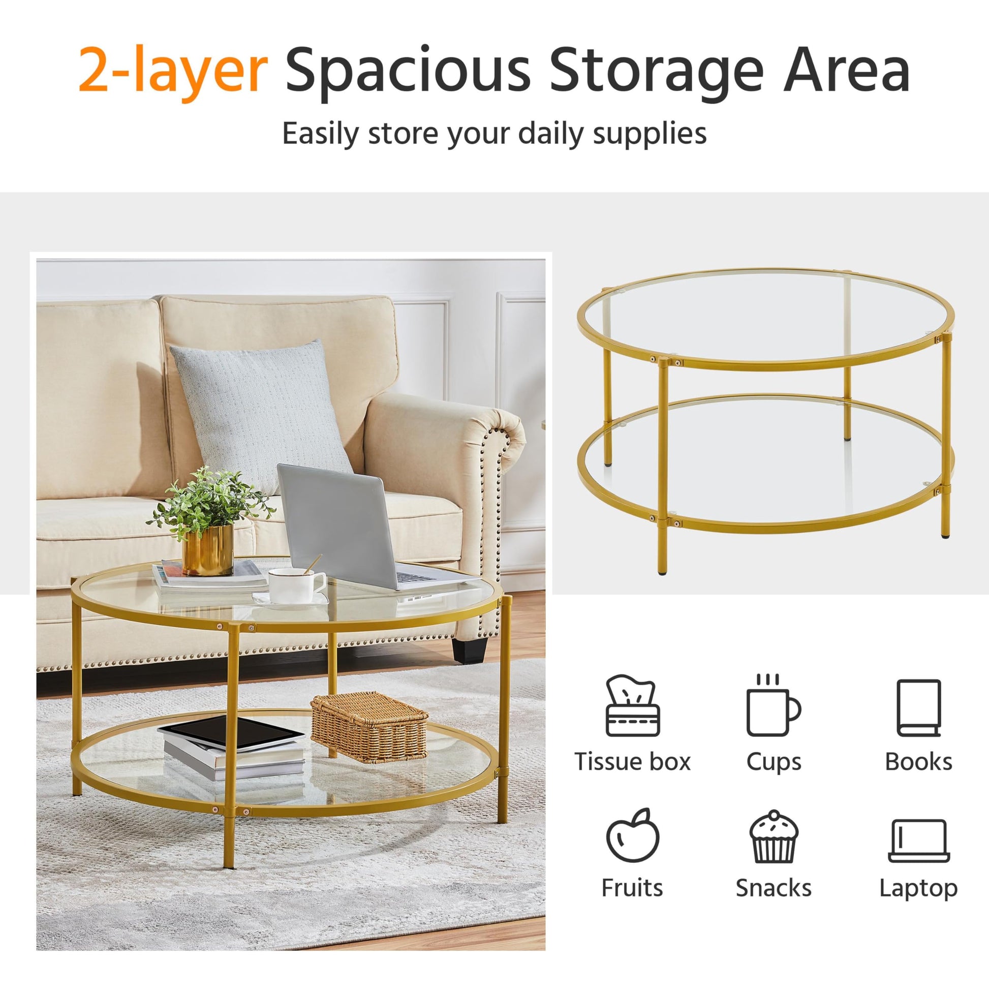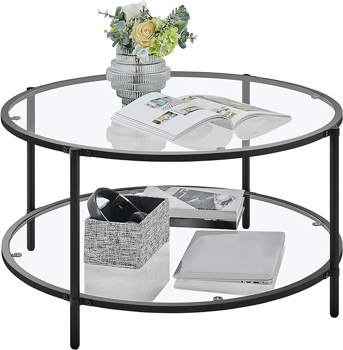 - This round tempered glass coffee table has 2-tier open shelf for living room items such as cups, books, tissues,toys and a variety of items.The 36inch desktop has enough space to keep your items handy and organized.