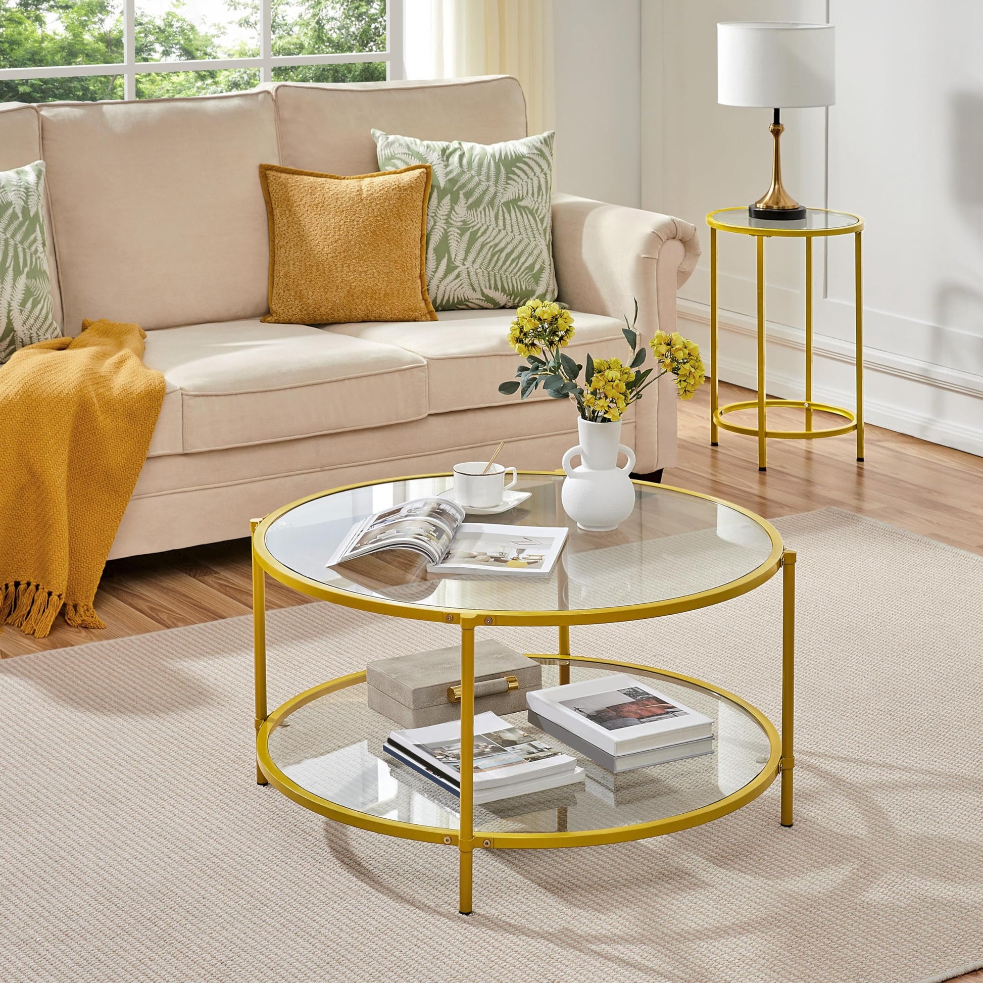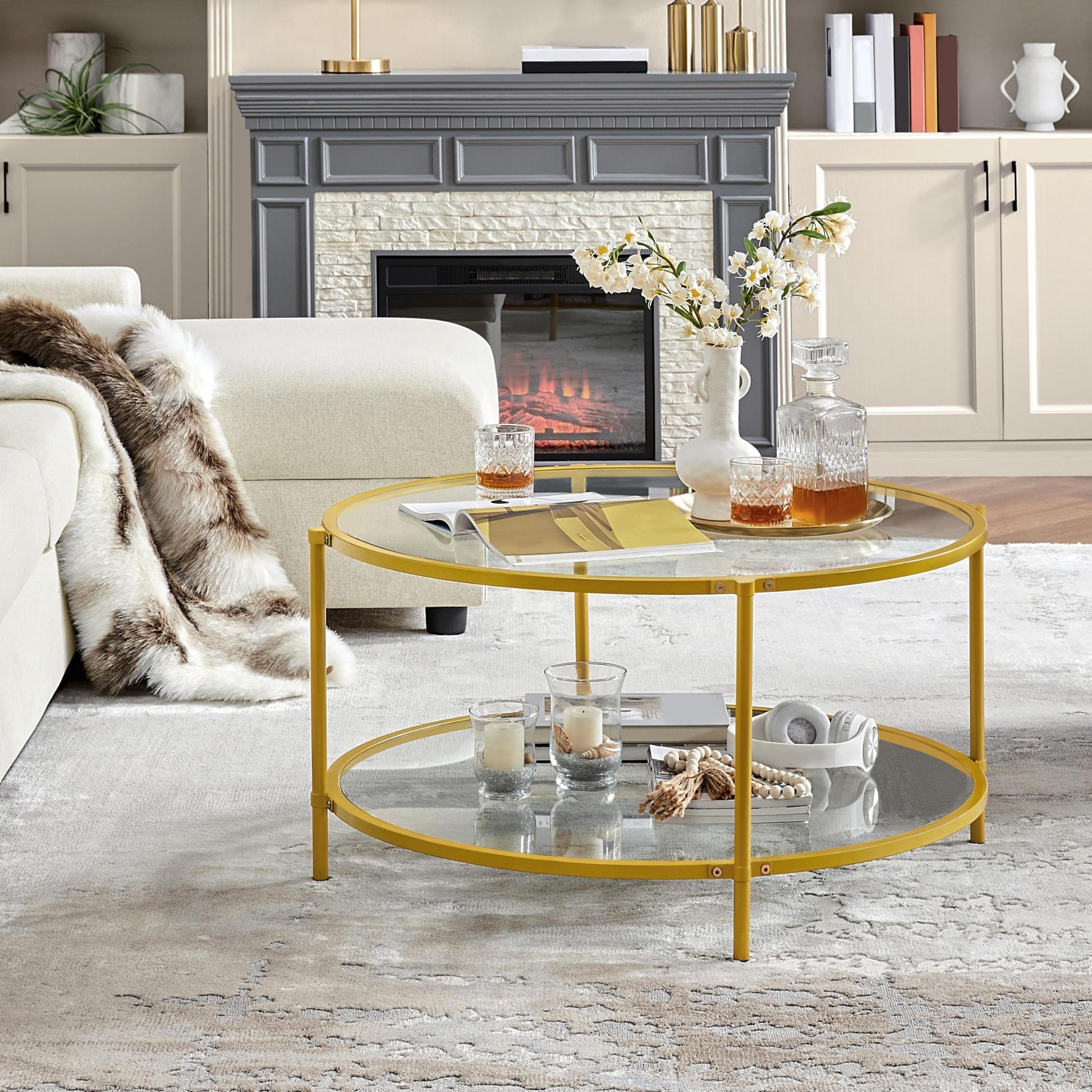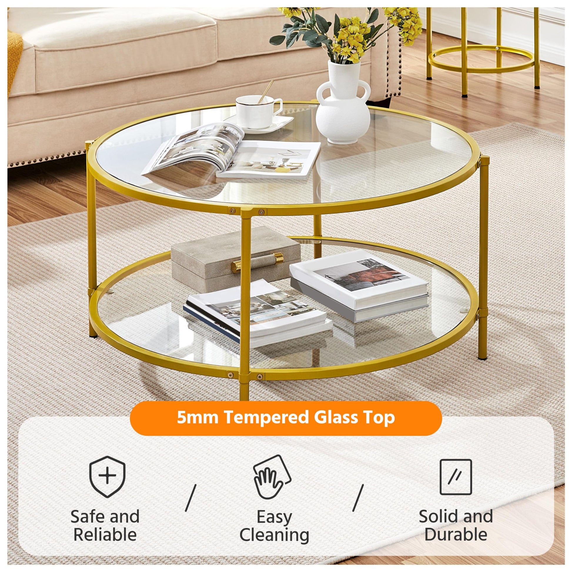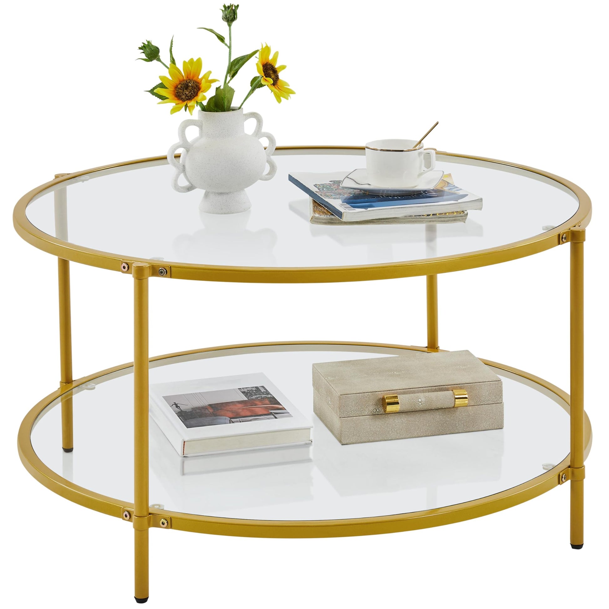 - This round tempered glass coffee table has 2-tier open shelf for living room items such as cups, books, tissues,toys and a variety of items.The 36inch desktop has enough space to keep your items handy and organized.