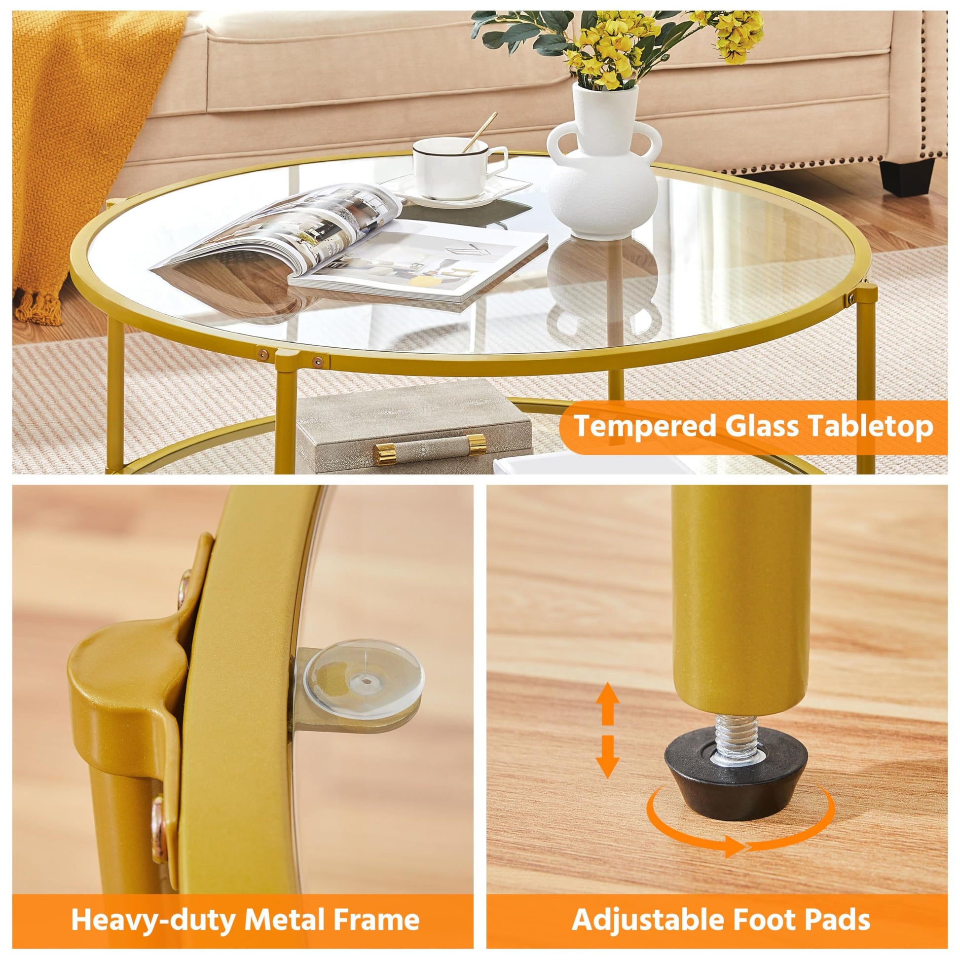 36" Round Coffee Table, Glass Coffee Table with Storage Shelf