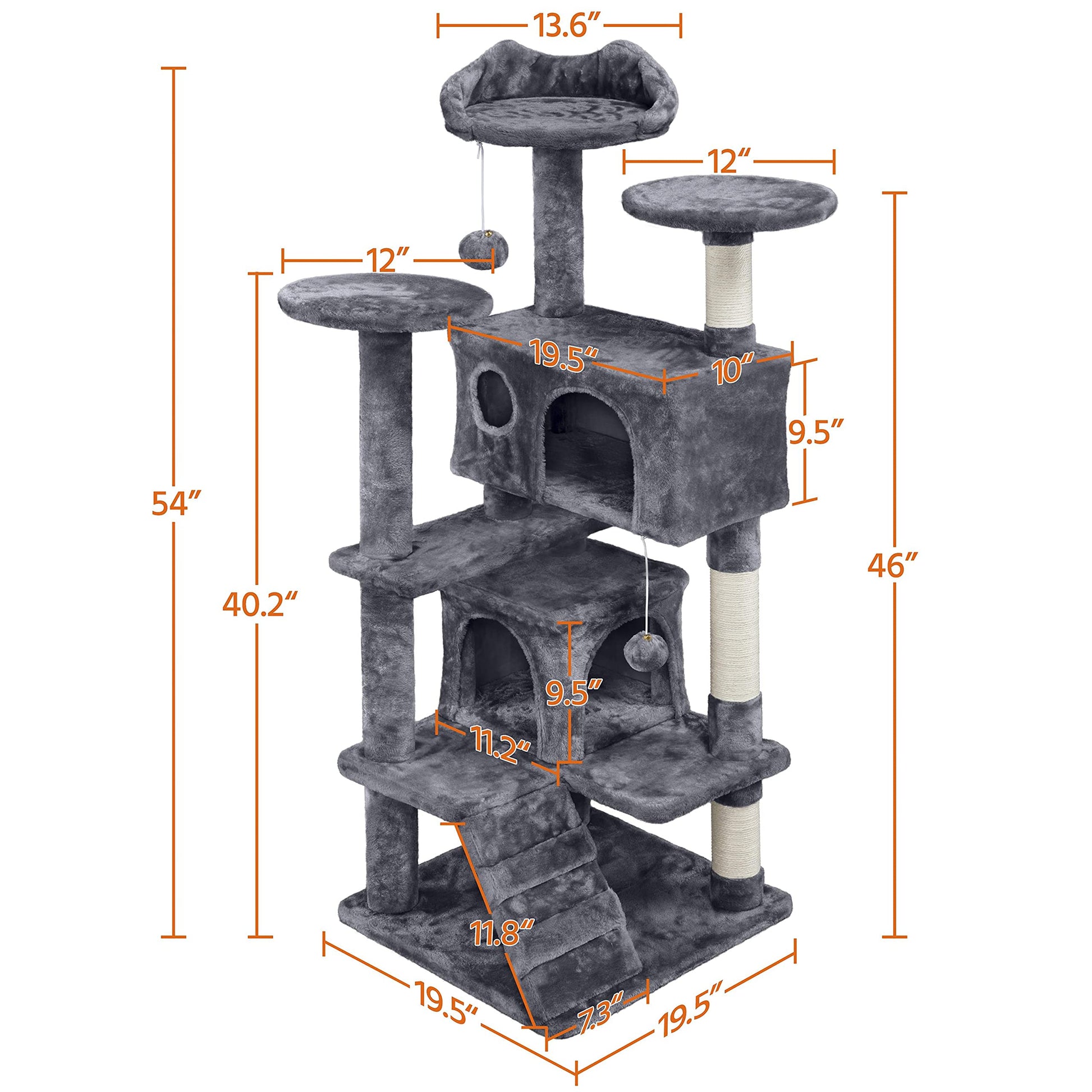 - Two Interactive Balls: The cat condo hangs two fur balls which will add extra fun for cats. round platform Dia.: 12”, big room:19.5"Lx9.6"Wx9.4’’H, small room: 11.2"L x 11.2"Wx 9.5’’H, Max Load Capacity up to 44Lb. This cat tree is for small and medium cats, if your cat is too big, pls don't purchase!