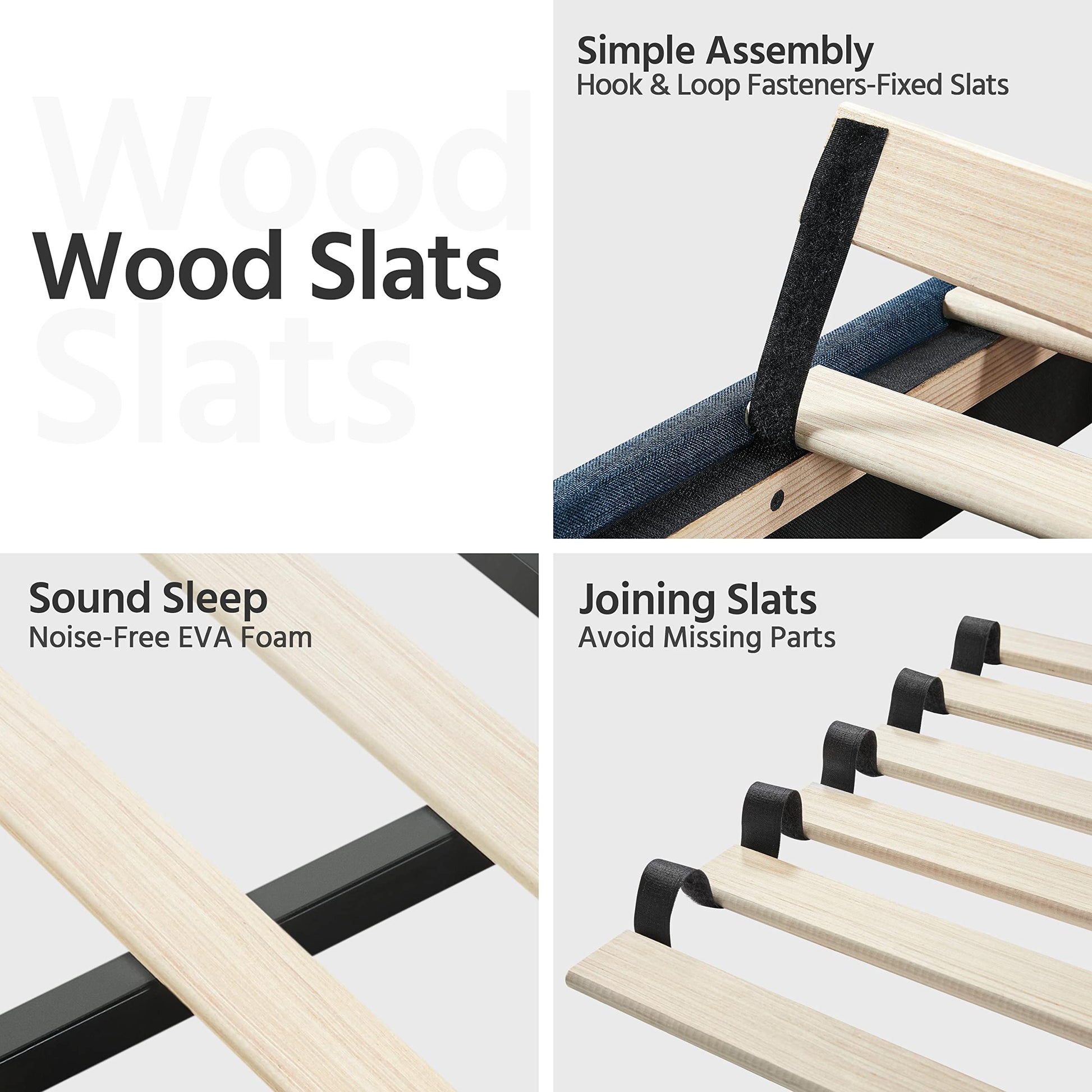 - Require no bulky box spring or any other extra foundation. After assembling the upholstered bed frame with adjustable headboard, just put your latex, foam or spring mattress on the wooden slats, and everything is all set.