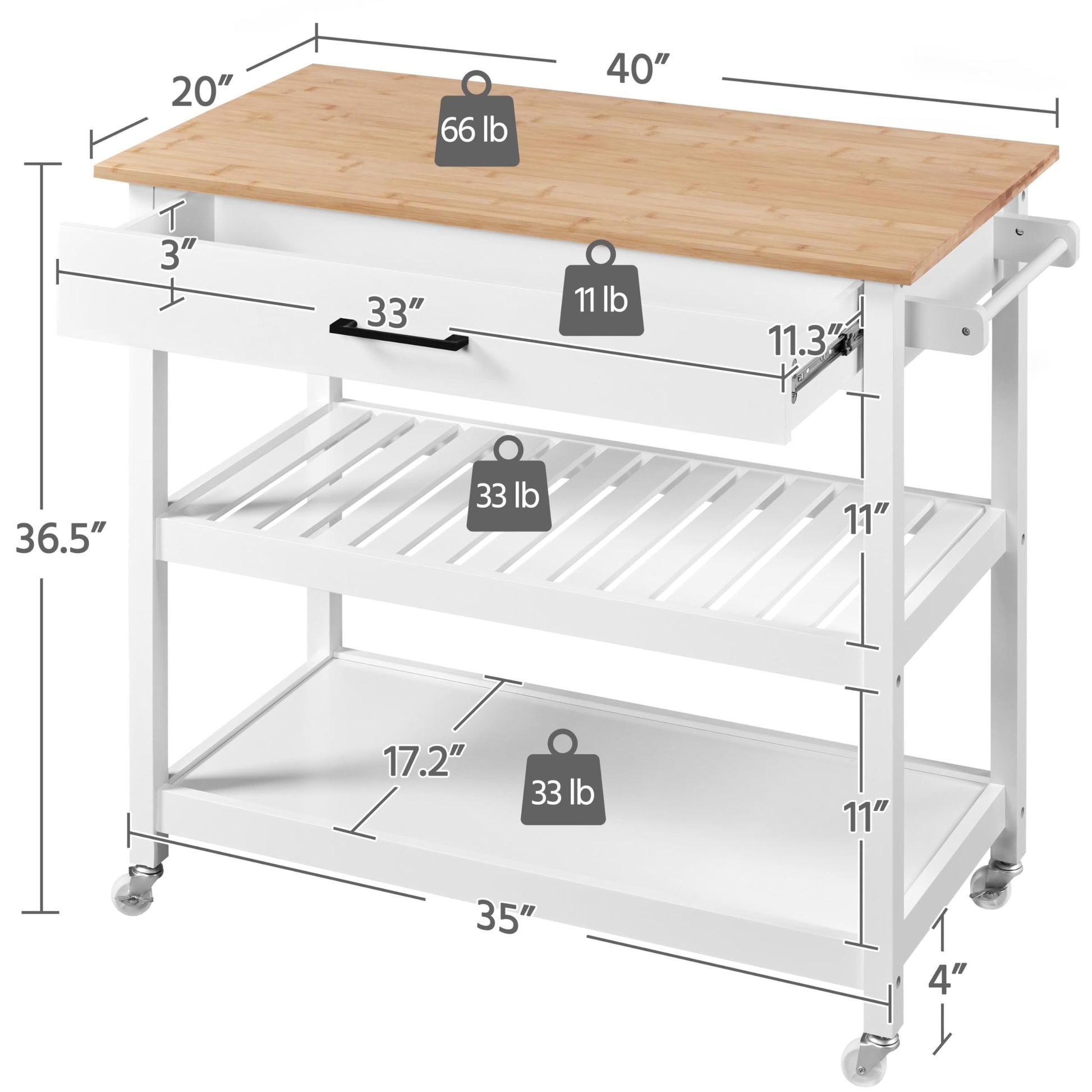 - Sturdy Wood Construction Supported by solid pinewood legs, this rolling kitchen island features a varnished bamboo countertop and CARB Phase 2-compliant MDF that requires no further waxing or finishing. The countertop easily holds up to 66 lb, and 33 lb for each shelf.