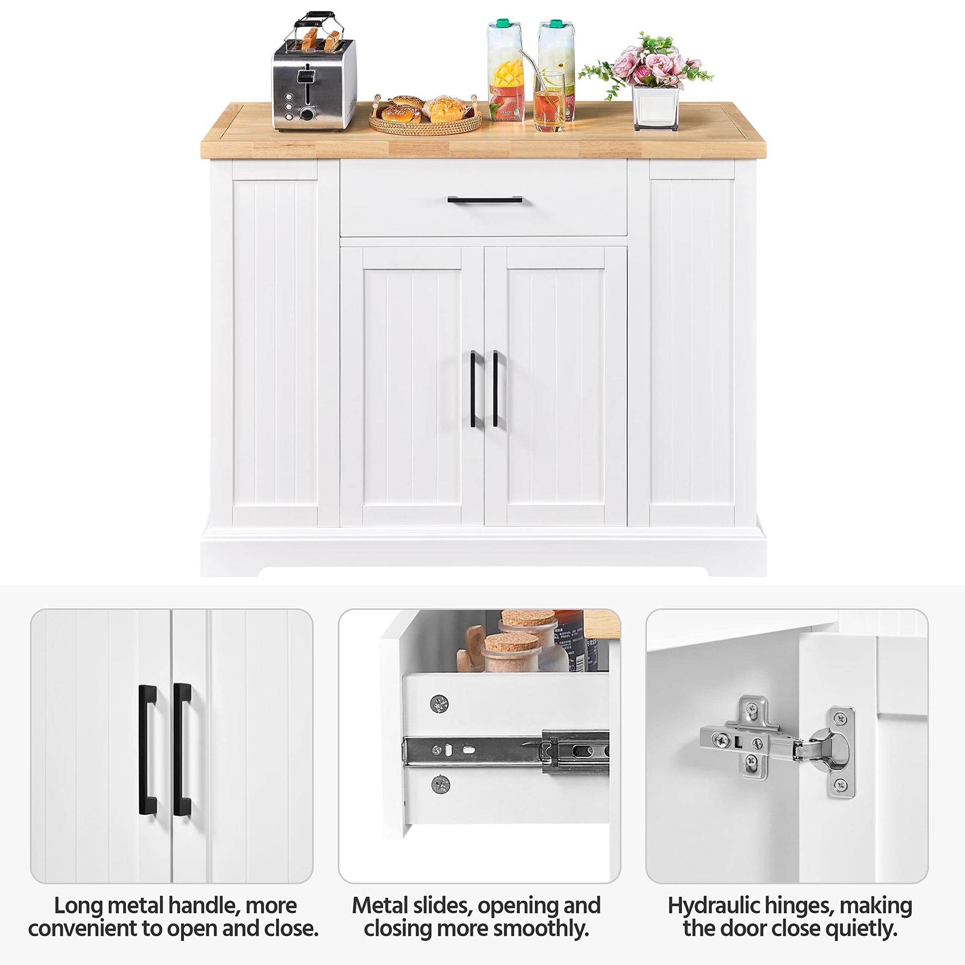 - Make Kitchen Items At Handy A wide countertop to store kitchen appliances like coffee makers and air fryers or snacks. A roomy drawer on full extension metal slides offers out-of-sight storage for daily-used culinary tools like plates and silverware; 2 side drawers can hold small-sized kitchenware like knives and napkins; the double-door cabinet and side open shelves store your food, bottles, and jars neatly.