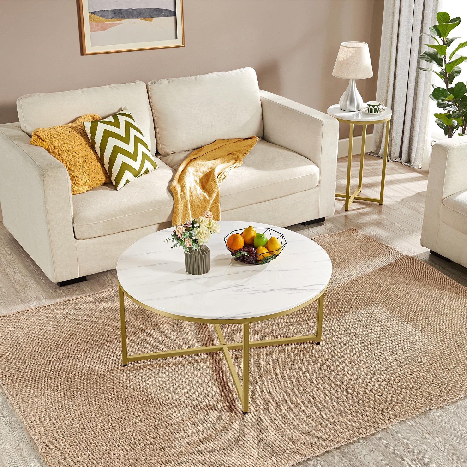 - This living room table set includes a coffee table and 2pcs side tables. Crafted of a premium iron frame and CARB P2 MDF, this round faux marble coffee table and end table can hold up to 51 lb and 55lb, respectively, capable of meeting the needs of daily use, party, or work.
