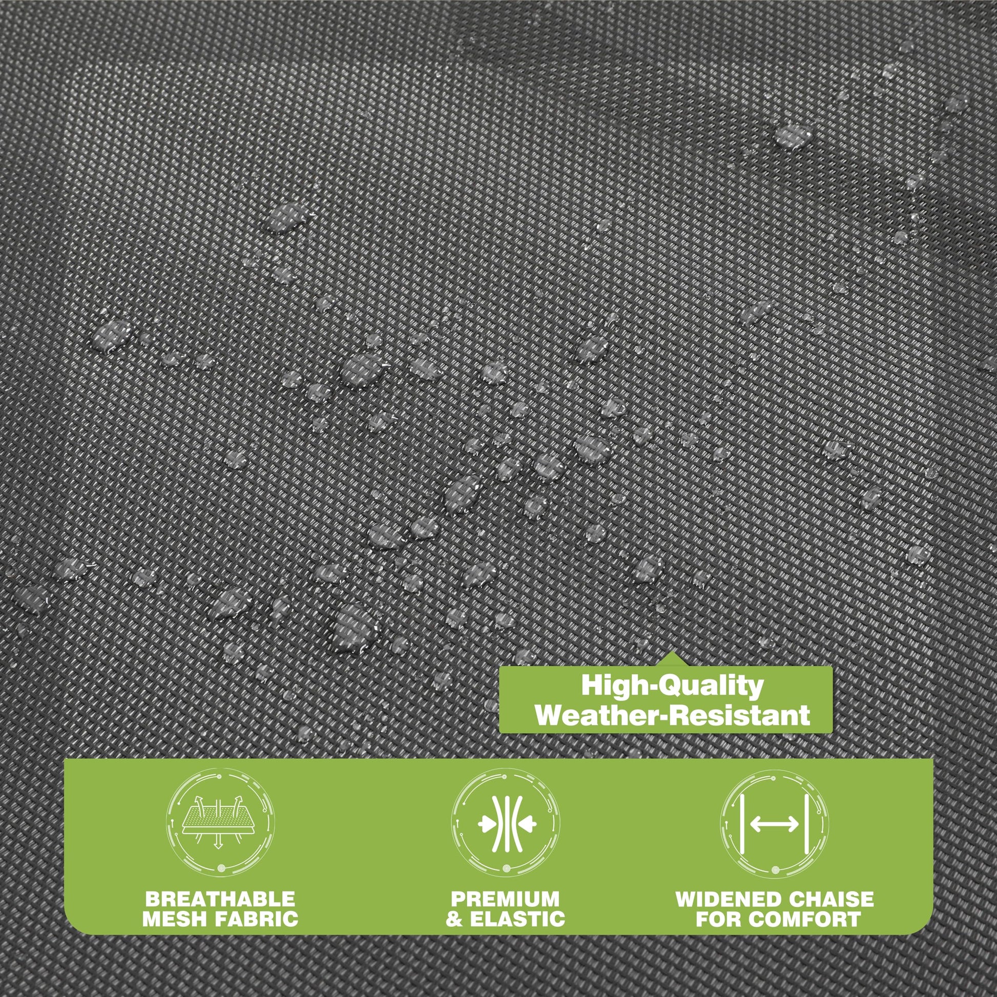- HIGH QUALITY MATERIAL This reclining chair is constructed with powder-coated black steel tube which combines practicality and beauty. It is rust-resistant and sturdy, allows the sun lounger to hold up to 265 lbs. With the anti-slip cap design for security, there is no worry about slipping. The waterproof mesh fabric is weather-resistant and breathable, you can have a more comfortable experience in our widened chaise lounge.