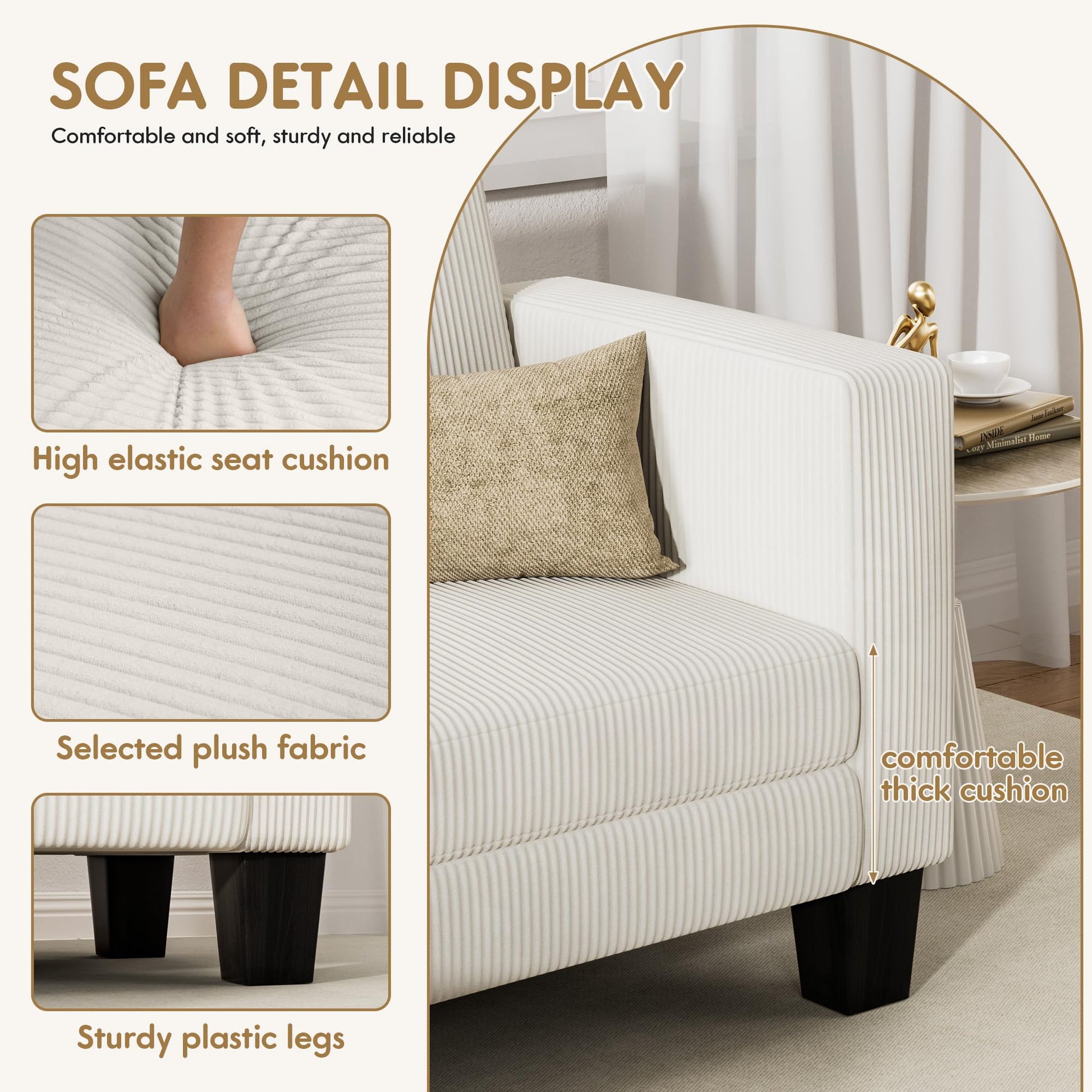 - LUXURY TOUCH AND SUPPORT: Selected corduroy fabrics are skin-friendly and soft, with high-grade sponge filling, the sitting feeling is both soft and elastic, ensuring long-lasting comfort. The cushions are vacuum compressed and are recommended to be left for 24 hours after arrival to allow them to fluff up naturally and show their perfect shape.