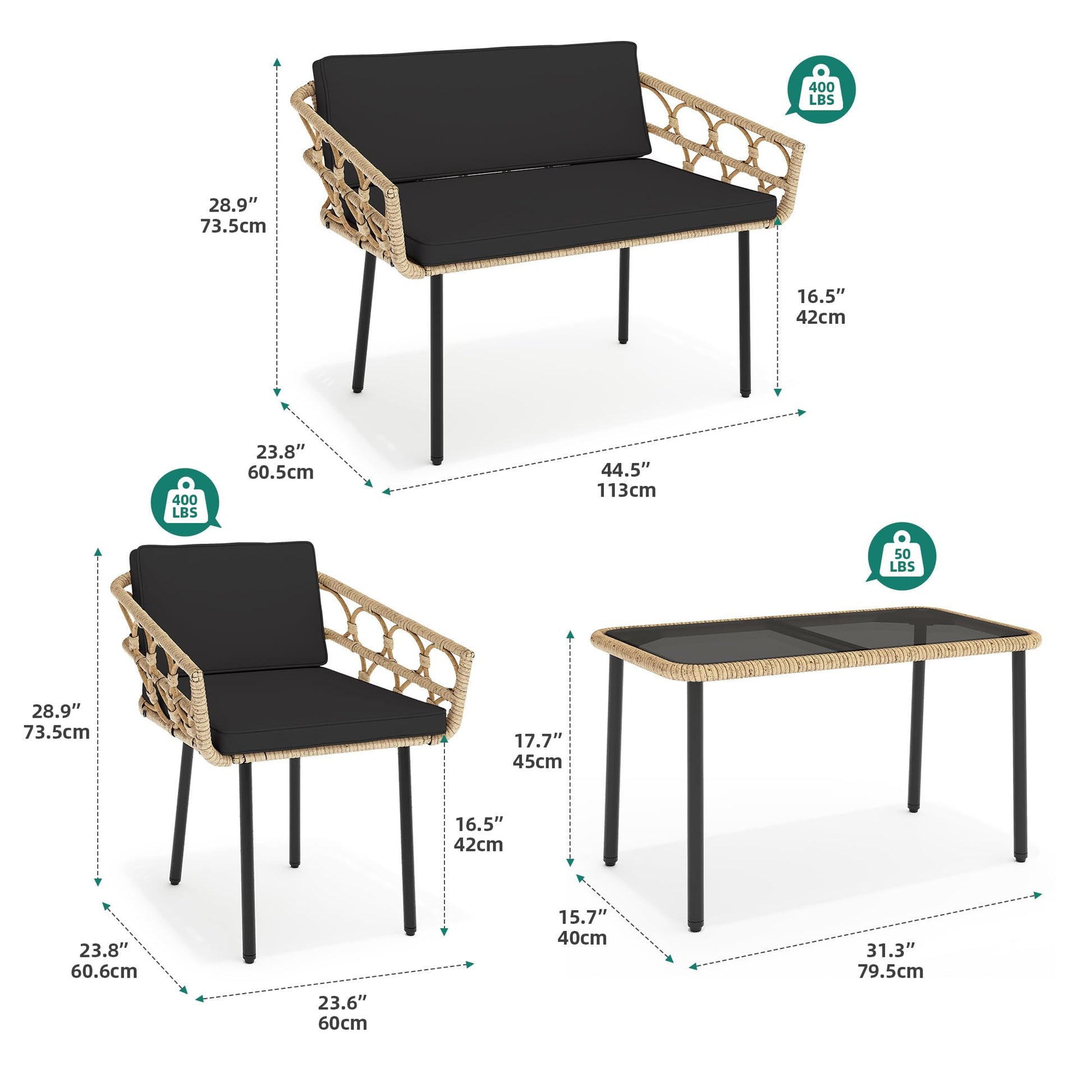 - Ultimate Leisure Experience: Elevate your outdoor space with this stylish 4-piece set. Includes a comfy loveseat, two armchairs, and a modern coffee table, ideal for relaxing and enjoying sunny days with friends and family