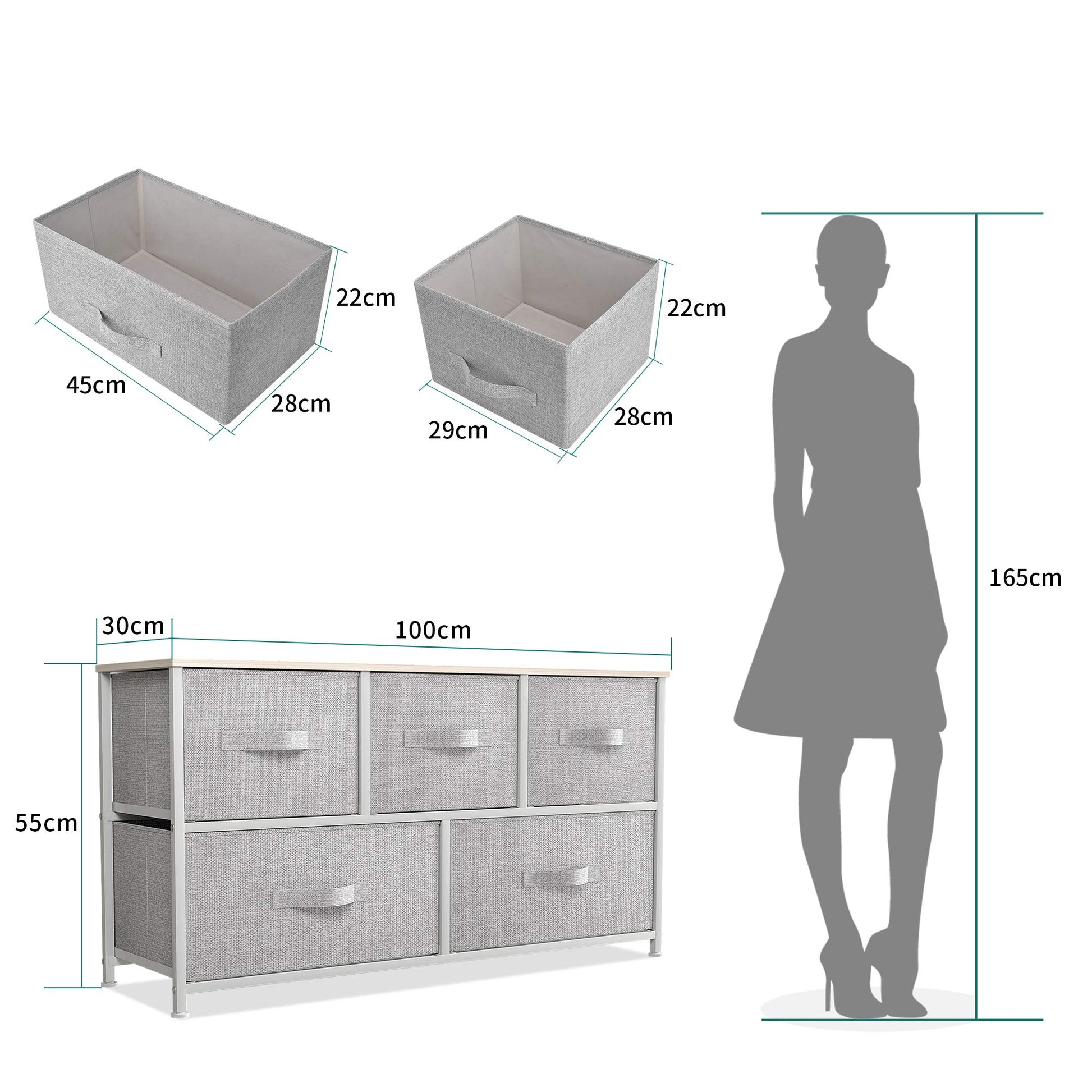 - QUALITY CONSTRUCTION - Made from reliable metal frame and durable MDF wooden top; 5 removable and foldable drawers; Easy-pull fabric handles allow drawers to be conveniently opened and closed; 4 adjustable plastic feet protect your floor from scratches