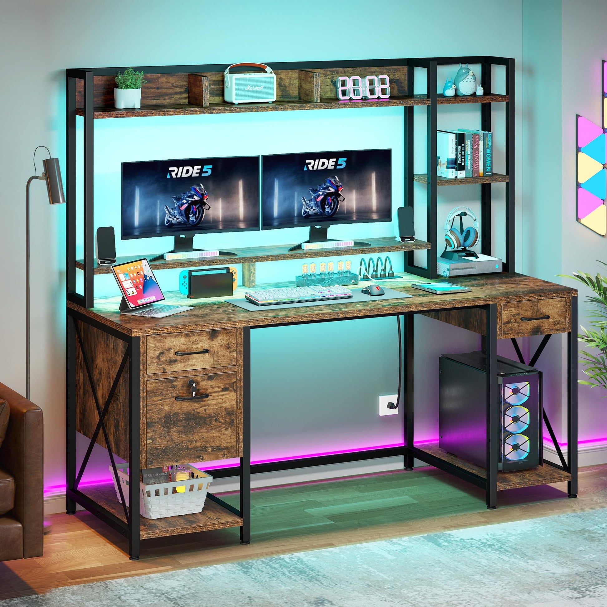 - Ample Storage Capacity: To maximize your space and keep everything within reach, the computer desk offers ample storage, with 3 drawers, top hutch, side storage shelves, and full monitor stand. Spacious tabletops and monitor stand (59.1" and 19.68") hold 2 monitors and other essentials for gaming activities, home office work and other activities