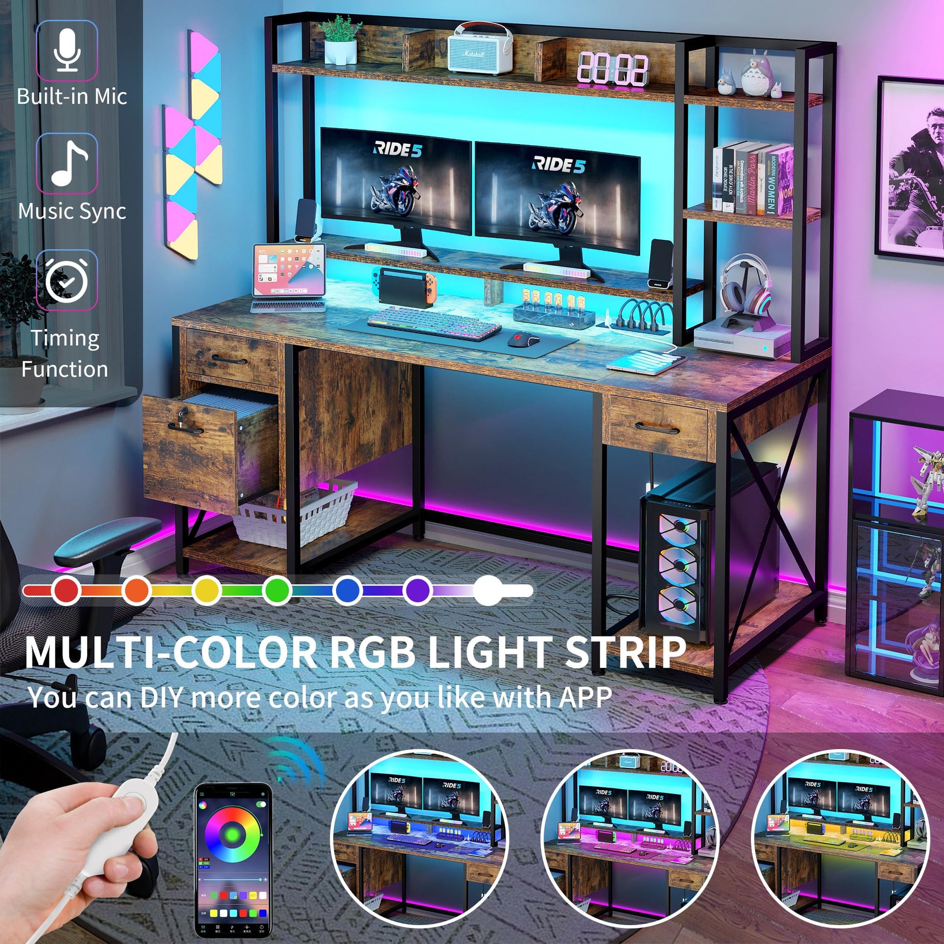 - LED Light Strips: Our gaming desk features a beautiful RGB LED light strip, flexibly controlled by a phone app or light strip switch, and you can customize any color you like via app. Plus, choose from various modes including music sync and timer functions to enhance the mood and inspire creativity while working