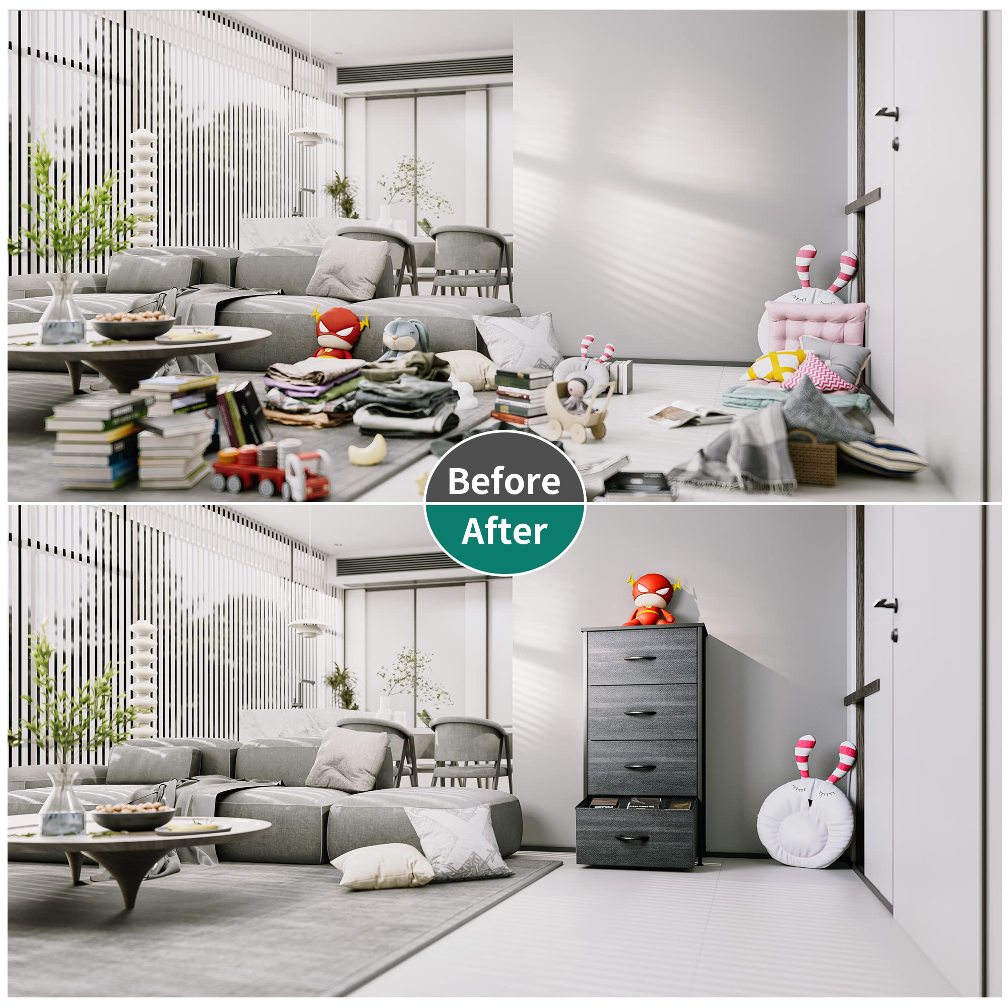 - UNIVERSALLY COMPLEMENTARY- Premium charcoal fabric drawers with sturdy black metal frame and wooden tabletop; Enjoy modern scent and stylish aesthetics that easily complements various living spaces: living rooms, bedrooms, hallways, entryways, closets etc