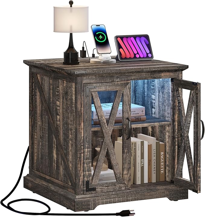 - LED Lights Bedside Table: This nightstand table comes with an LED light pair a cozy and welcoming farmhouse atmosphere. Charming elements include textured finishes and matte metal accents, it adds a charming farmhouse aesthetic and vintage ambiance to your room.
