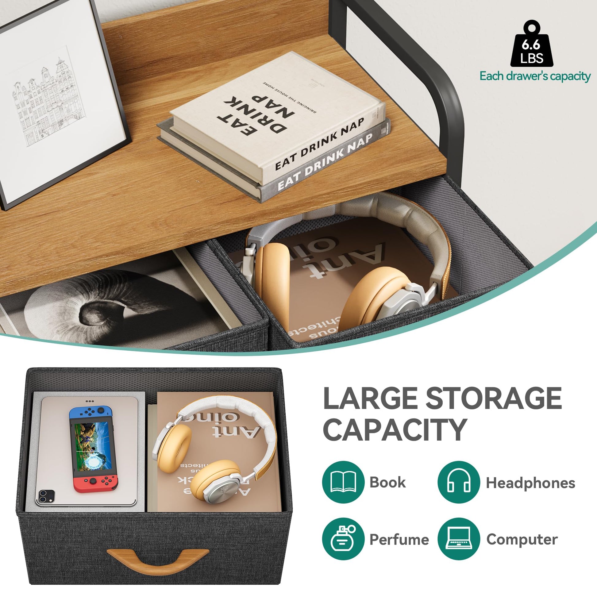 - UNIVERSAL MATCH- Premium dark grey fabric drawers, sturdy white metal frame and waterproof wooden tabletop give the storage organizer a modern style. This unit easily fits in various living spaces: living rooms, bedrooms, hallways, entryways, closets and nurseries, etc.