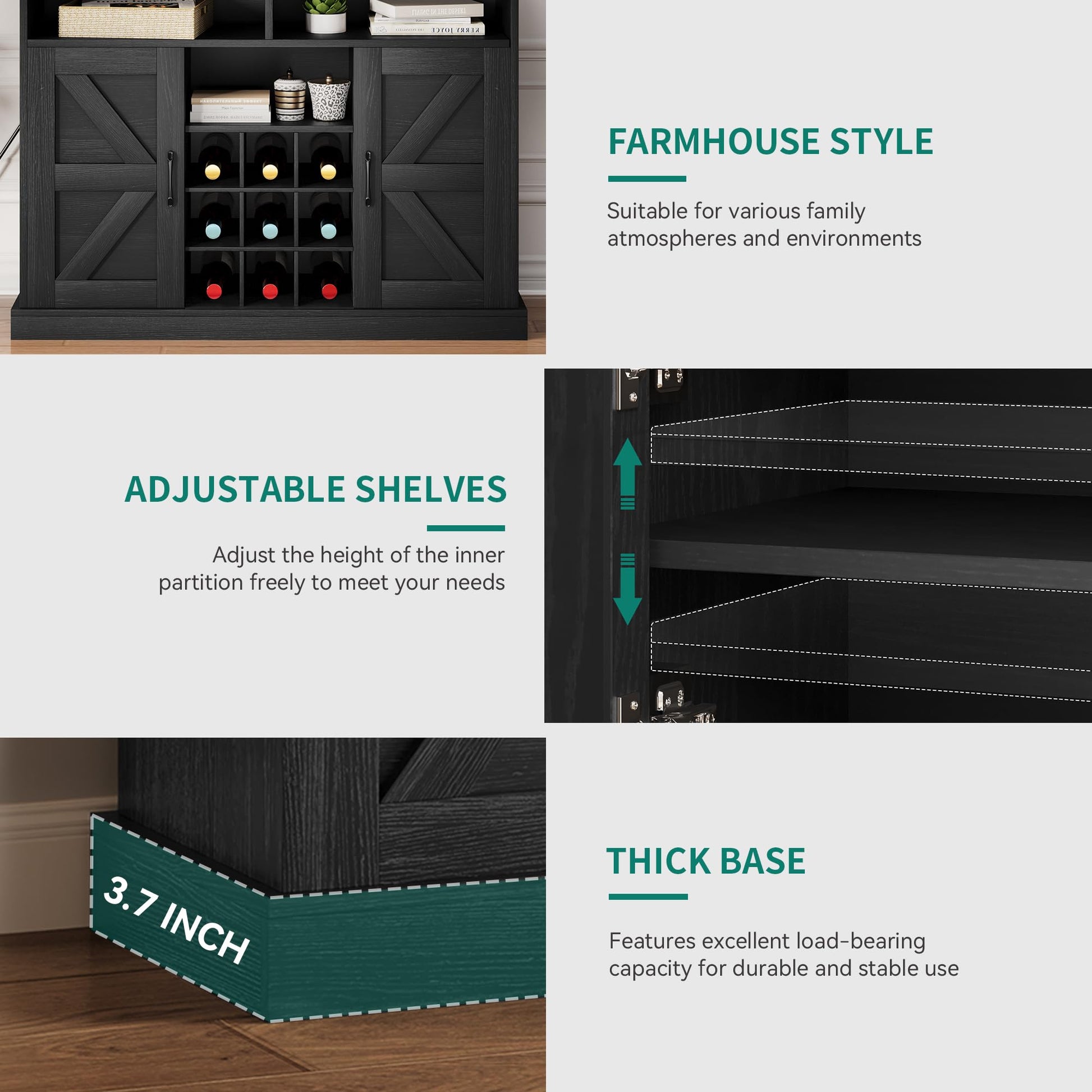 - Comes with a generously sized tabletop, three open storage compartments & 9 cubes, and two classic barn door cabinets with adjustable shelves. Great for storing coffee maker machines, microwaves, snacks, plates, wine bottles, coffee cups, saucers, and often-used items.