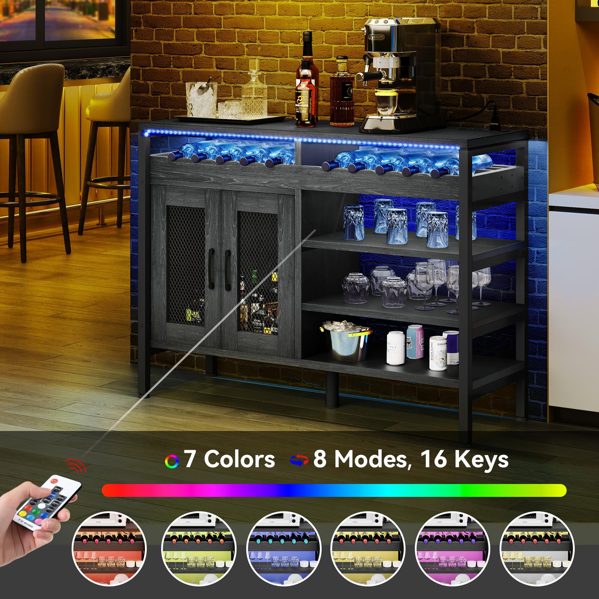 - LED Wine Cabinet: An adjustable LED light strip featuring 7 different colors and 8 modes is featured on this industrial liquor cabinet; RGB lighting elevates the atmosphere of your home bar