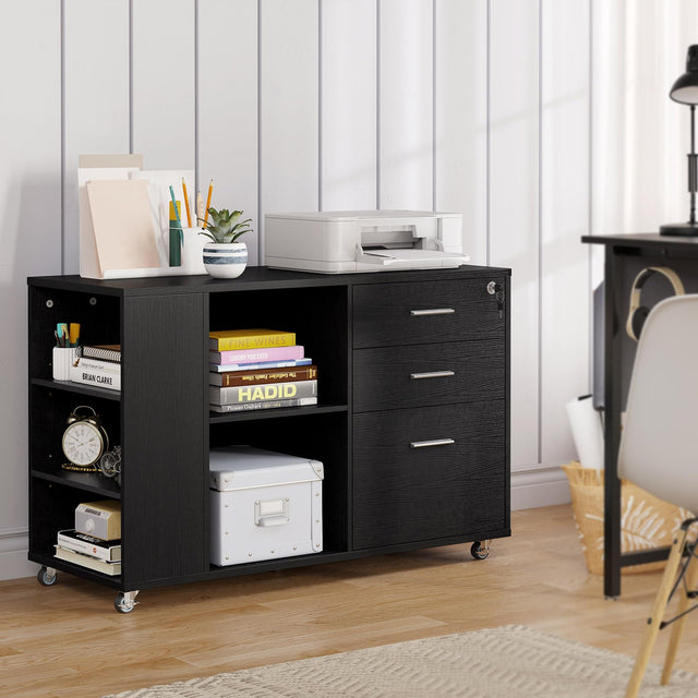 - FLEXIBLE STORAGE OPTIONS This lateral file cabinet meets your diverse storage needs, with 1 large desktop to place printer or display lovely plants & decorations, 2 open front and 3 side shelves keep books, documents organized and easy to fetch, 3 upper drawers neatly store your notebooks, staplers, pens, major files, etc.