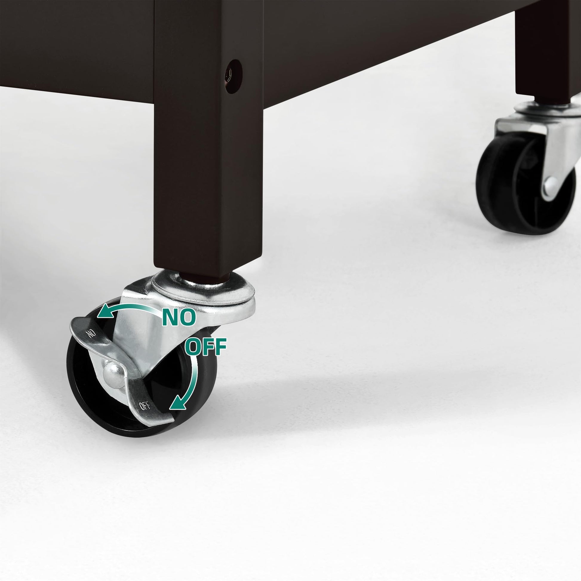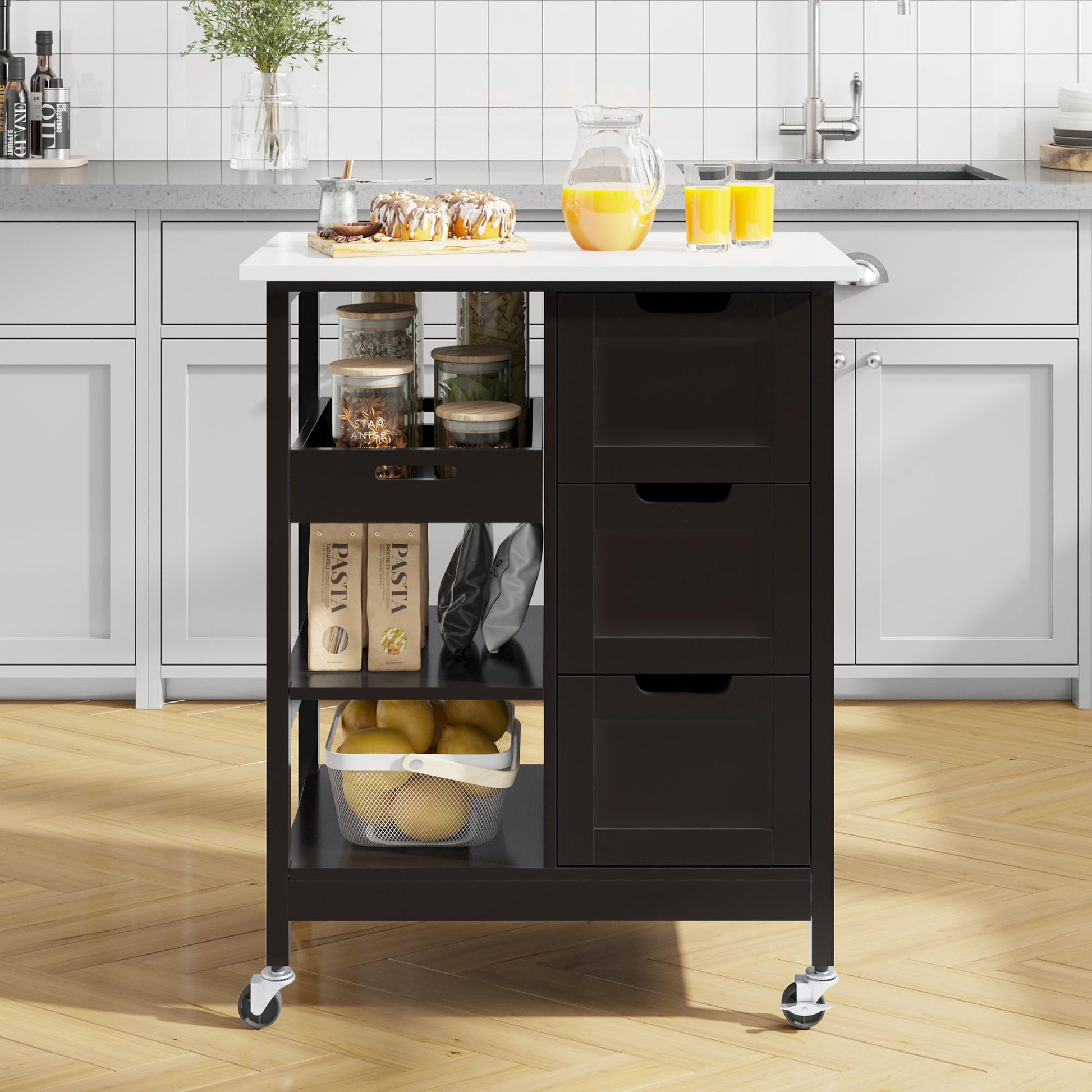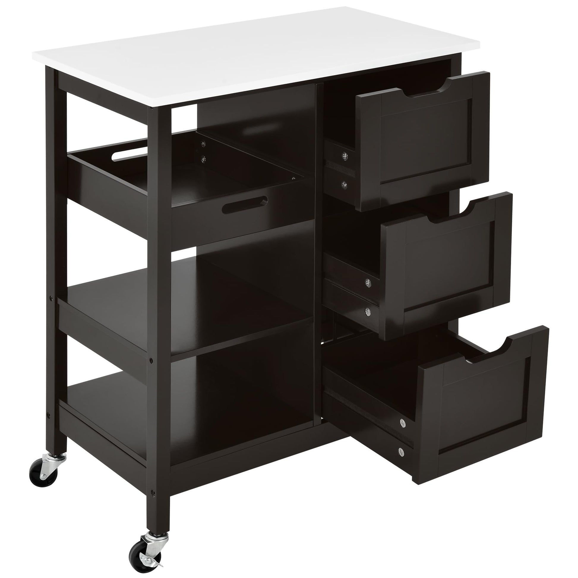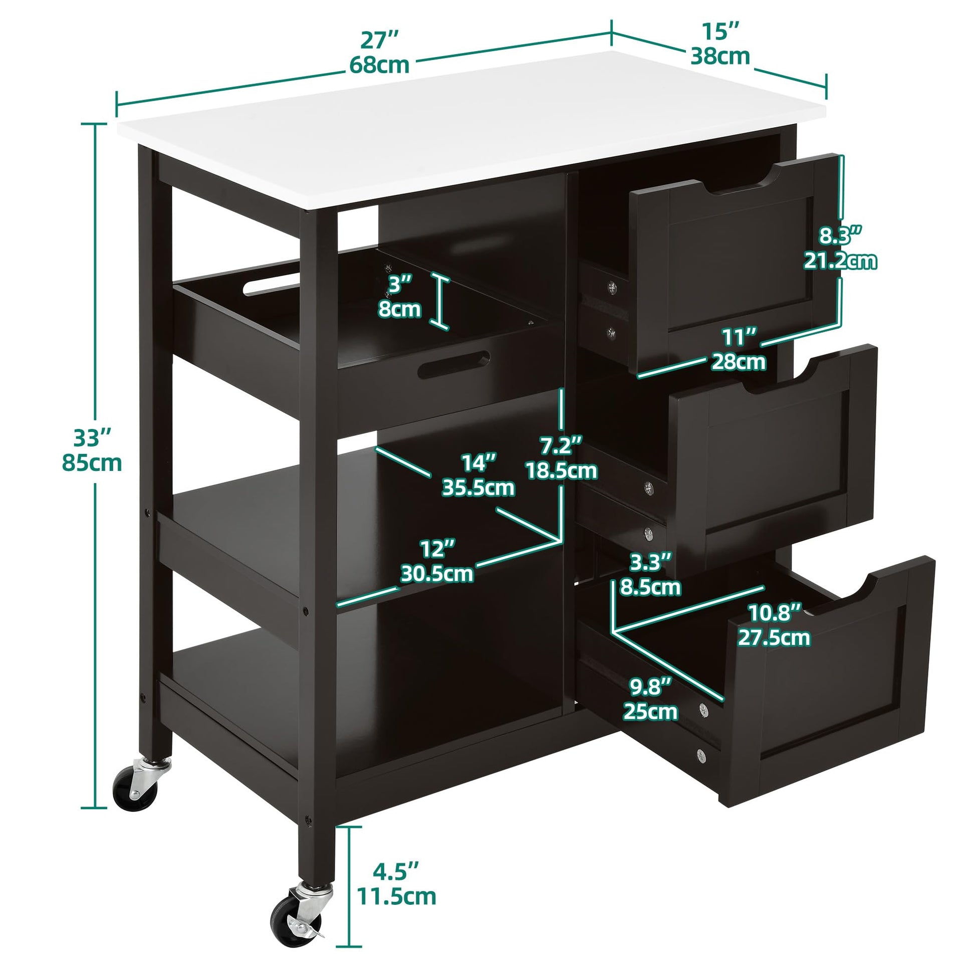 - ENOUGH STORAGE SPACE: The wide top of this espresso brown rolling storage cabinet can be used as a cutting board or stand to put a microwave oven or roaster; 3 open shelves & 3 drawers to classify cutlery, pots, pans & other essentials to keep your culinary space neat & clean for small kitchen & dining room.