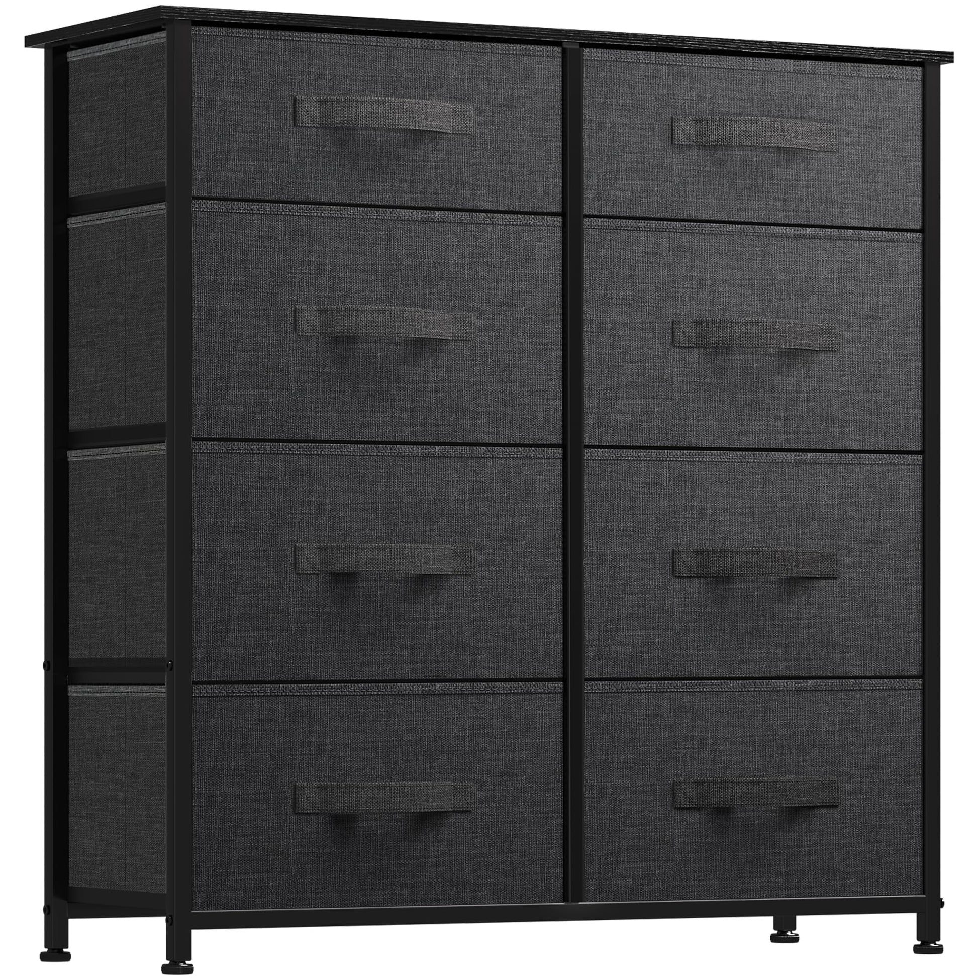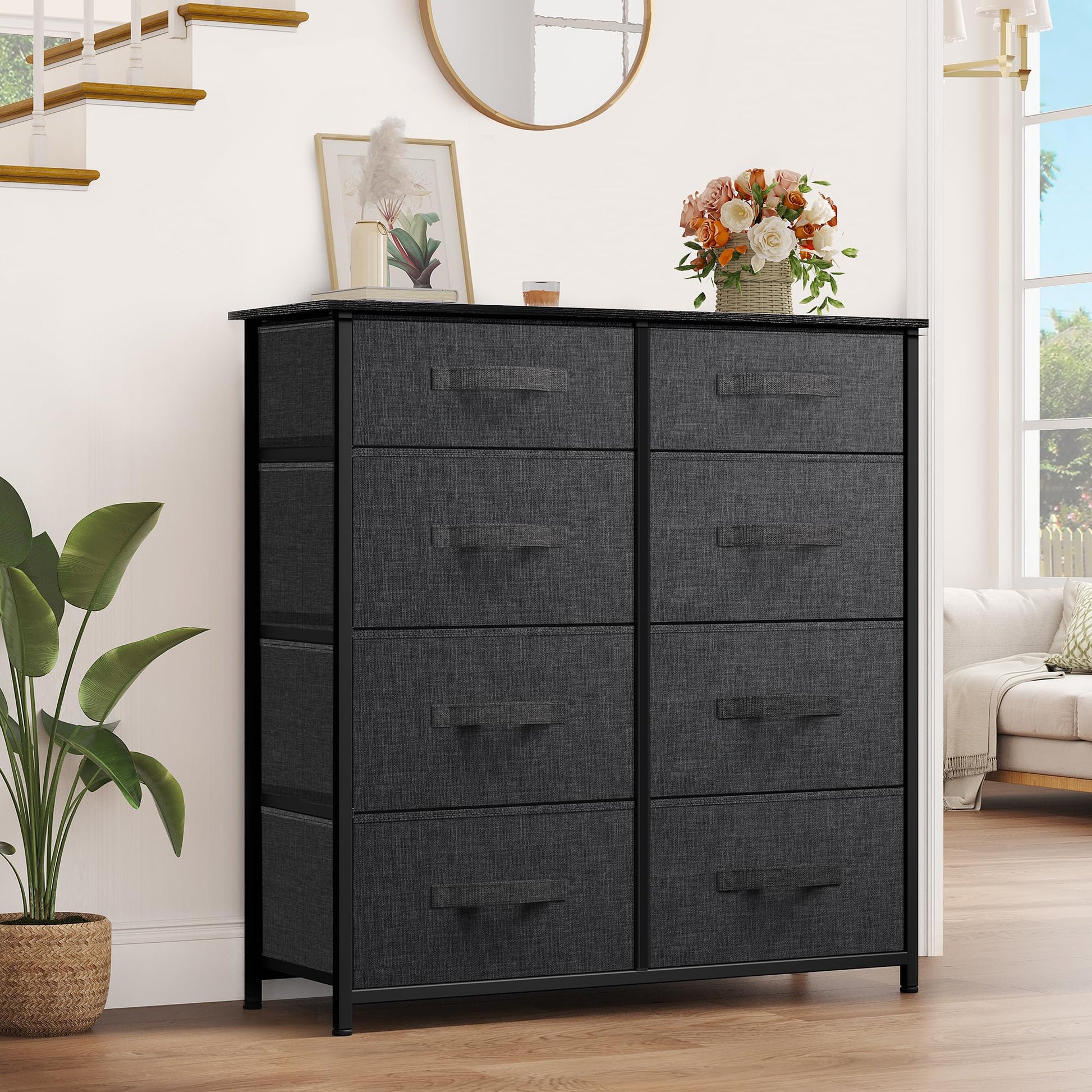 - QUALITY CONSTRUCTION- Structured with a powerful metal frame and a durable MDF wooden top; Contains 8 removable drawers with easy-to-pull fabric handles; Held up by 4 adjustable plastic legs that prevent scratches to your floor; The dresser can be secured to a wall with screws