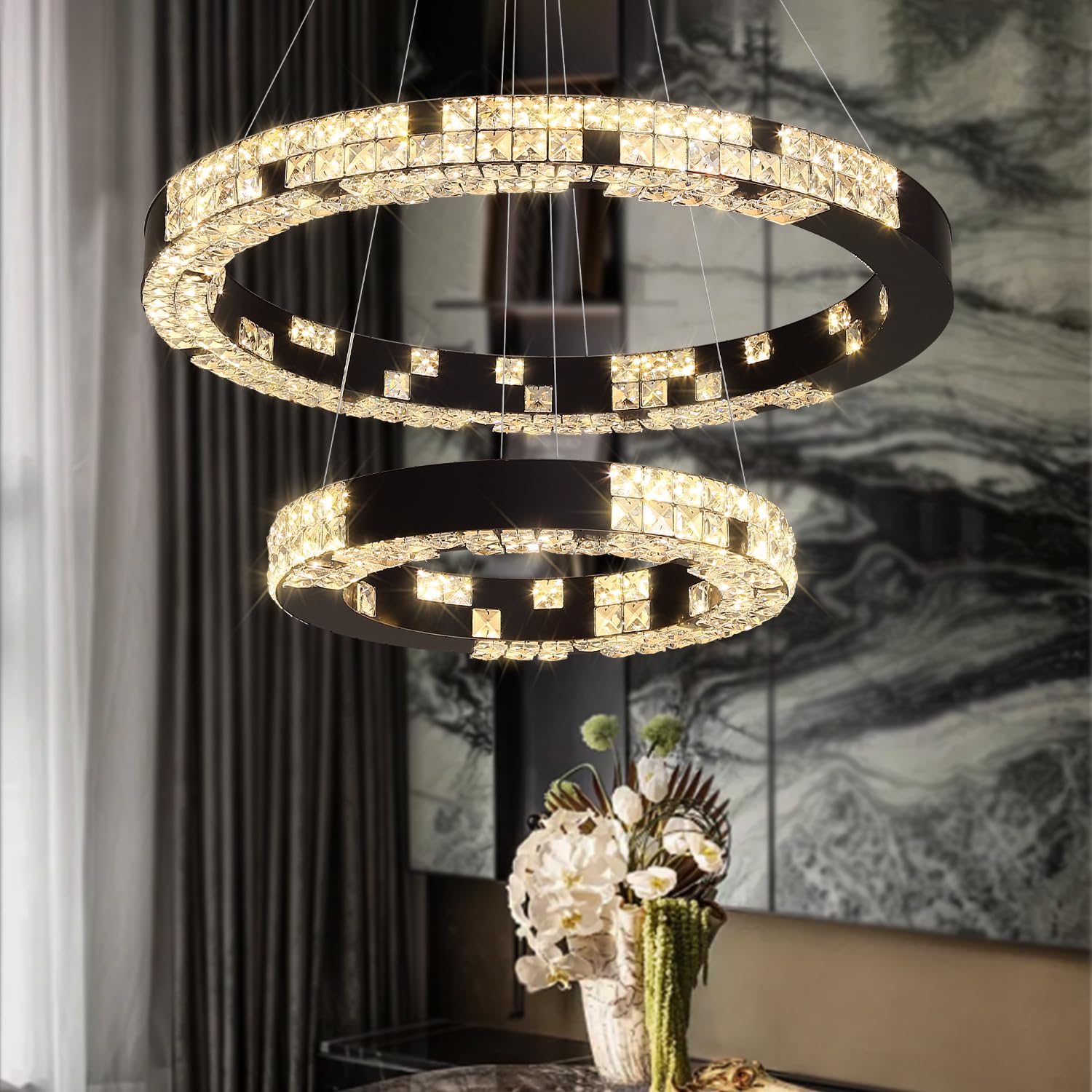 Modern Chandelier Black 2 Ring Crystal Chandeliers for Living Room High Ceiling Chandelier