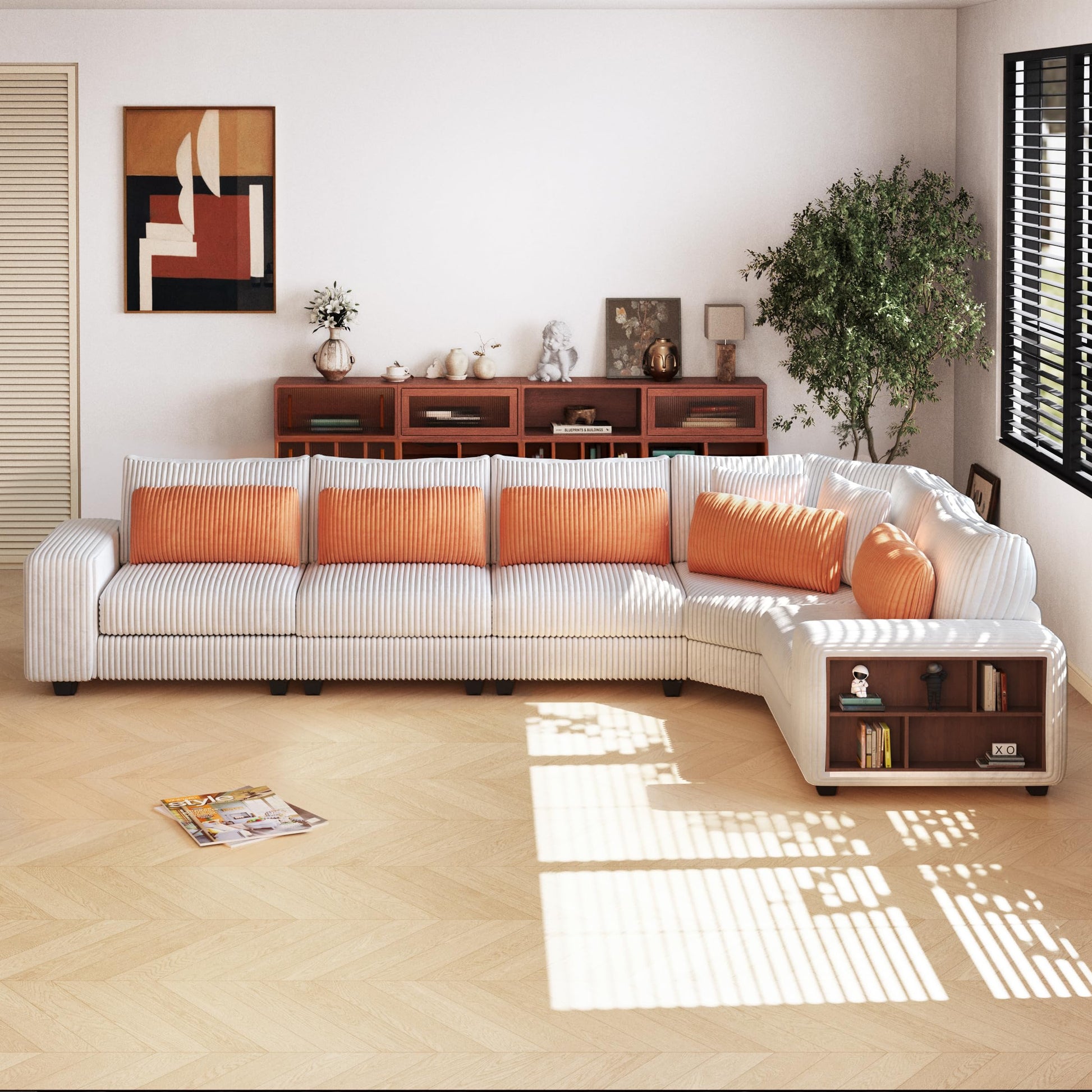 - This modern modular sectional sofa is all about flexibility. Its L-shaped or V-shaped design allows you to rearrange the pieces to fit your living room perfectly, whether you're working with a spacious layout or a cozy corner. The modular setup lets you customize the seating arrangement to suit your needs, making it ideal for any home.