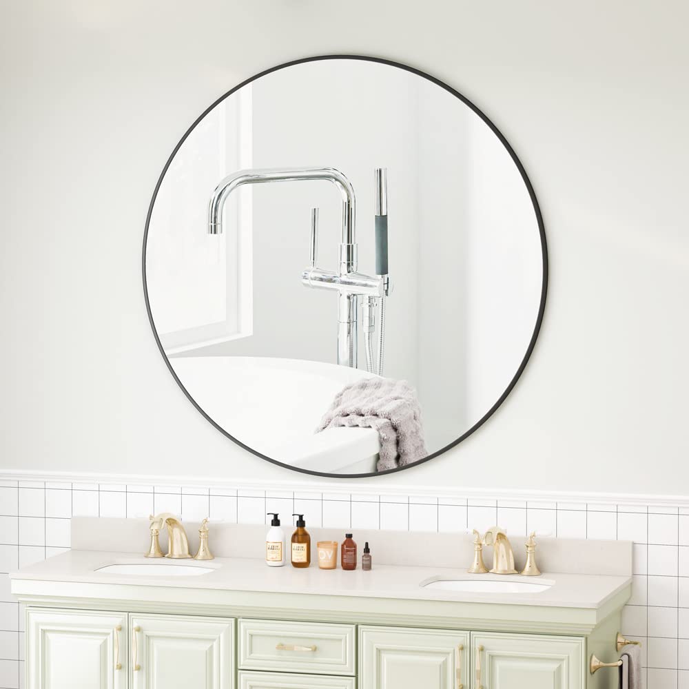 42" Round Mirror, Black Circle Bathroom Wall Mounted Mirror, Modern Deep