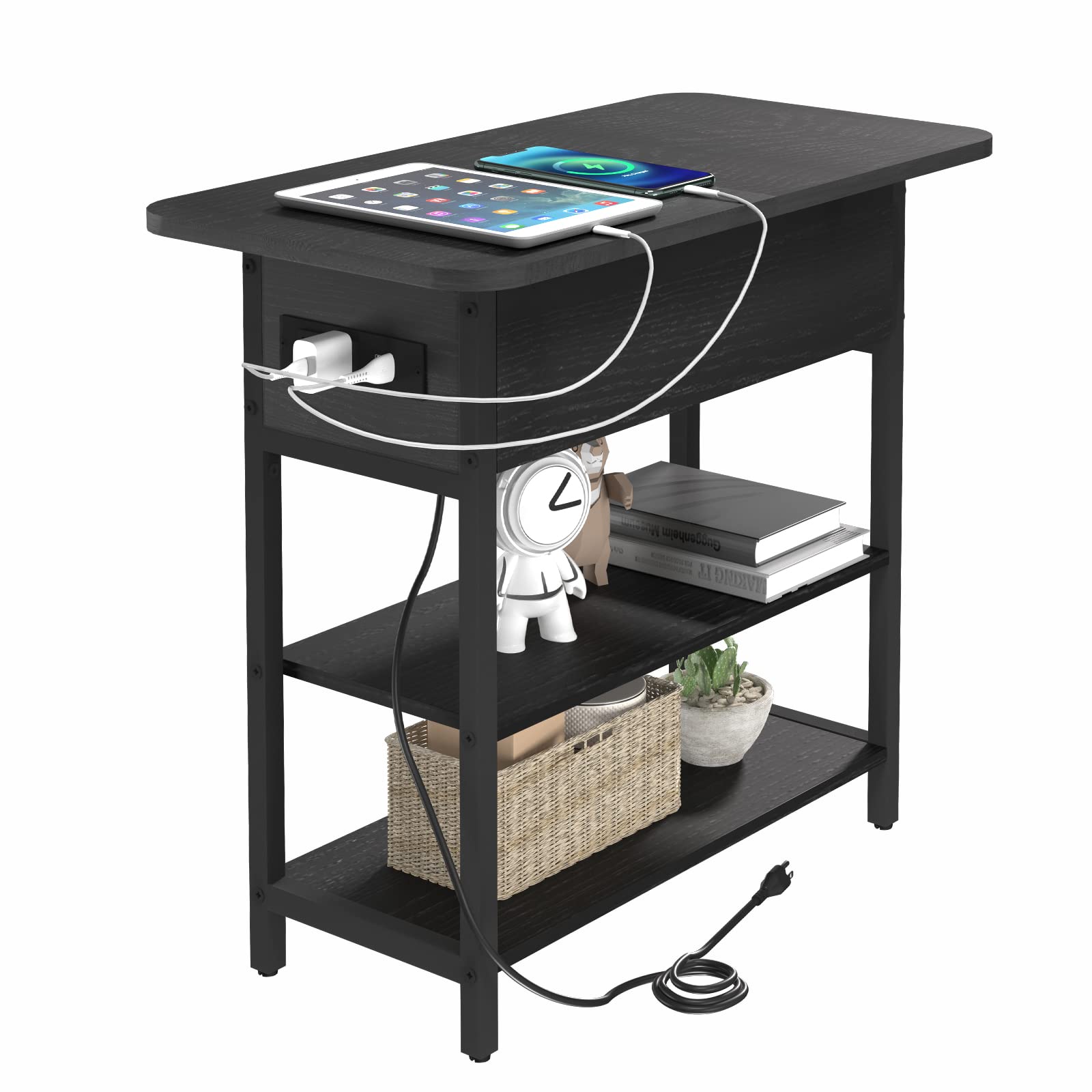 - Versatile End Table: The rustic narrow end table comes with a flip top drawer and 2-tier storage shelves offering ample space to storge and display where you can place your decorative lamps, drinks, phone, etc. This small bedside table is great for living room, bedroom and some small spaces