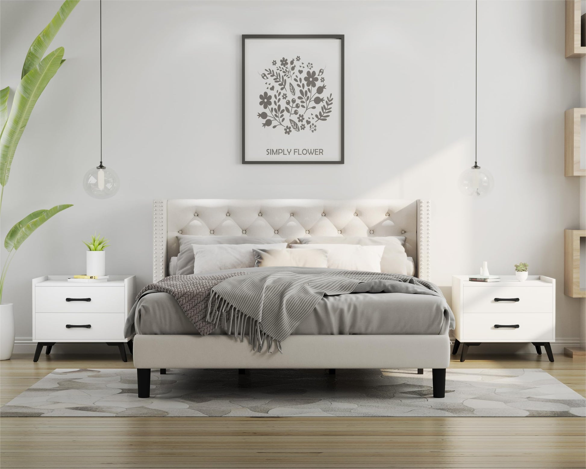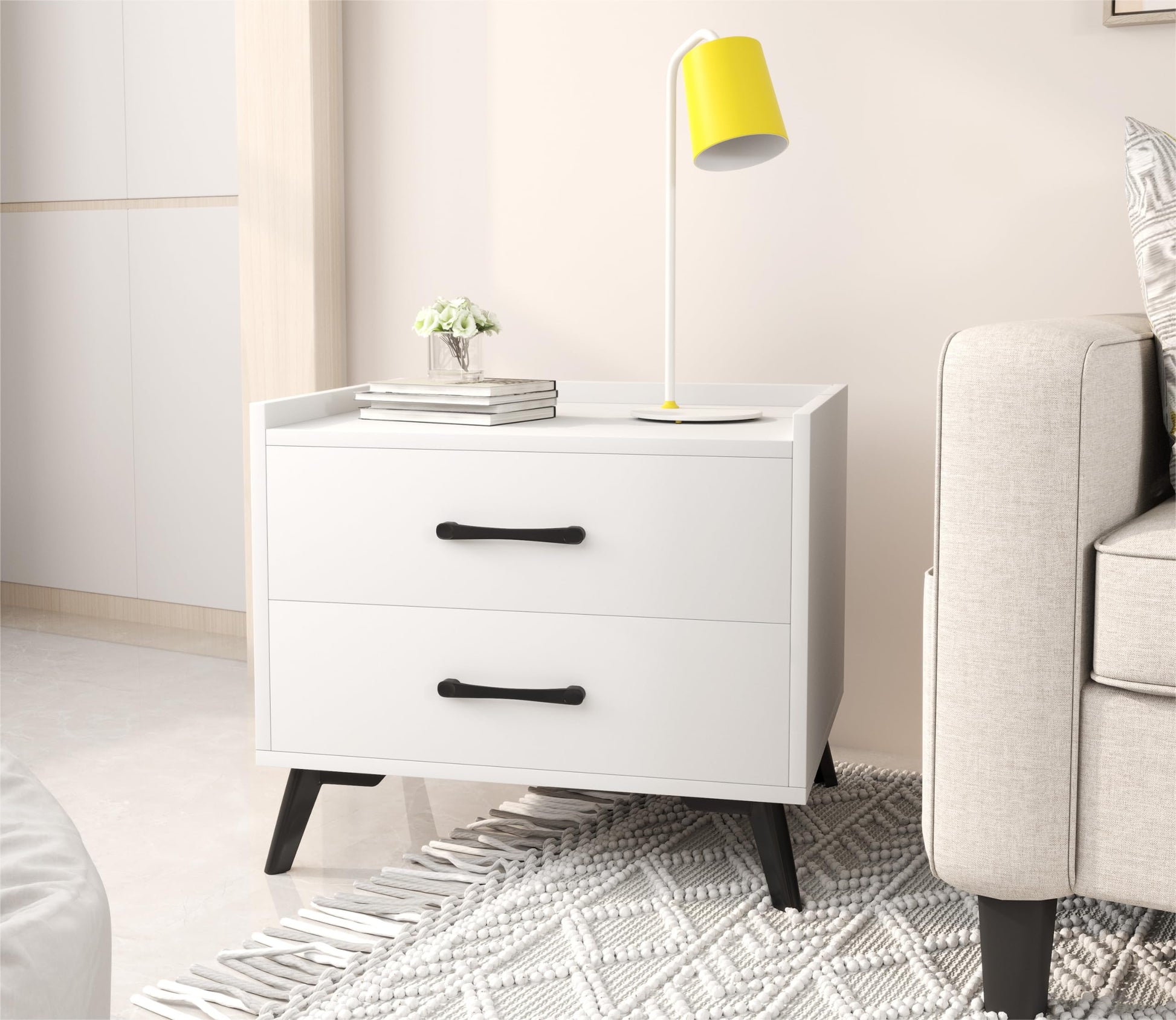 - Our white nightstand with 2 drawers provides ample storage space for all your essentials, keeping your bedroom clutter-free. Perfect for storing books, glasses, remote controls, and more.