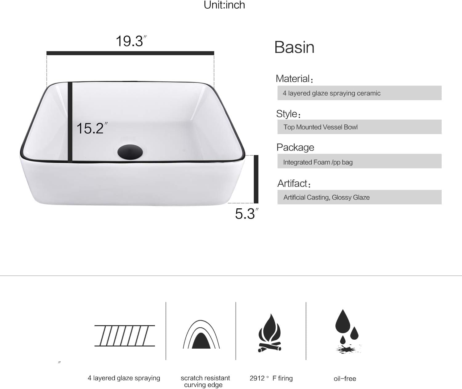 - 【Premium Ceramics 】: YORLITE vessel sinks for bathroom made from high quality premium ceramics to prevent breakage.Scratch-resistant ceramic makes cleaning the sink easier while maintaining lasting beauty. Sink dimension: 19.3''L x 15.2’' W x 5.3'' H, Bowl thickness: 0.5".