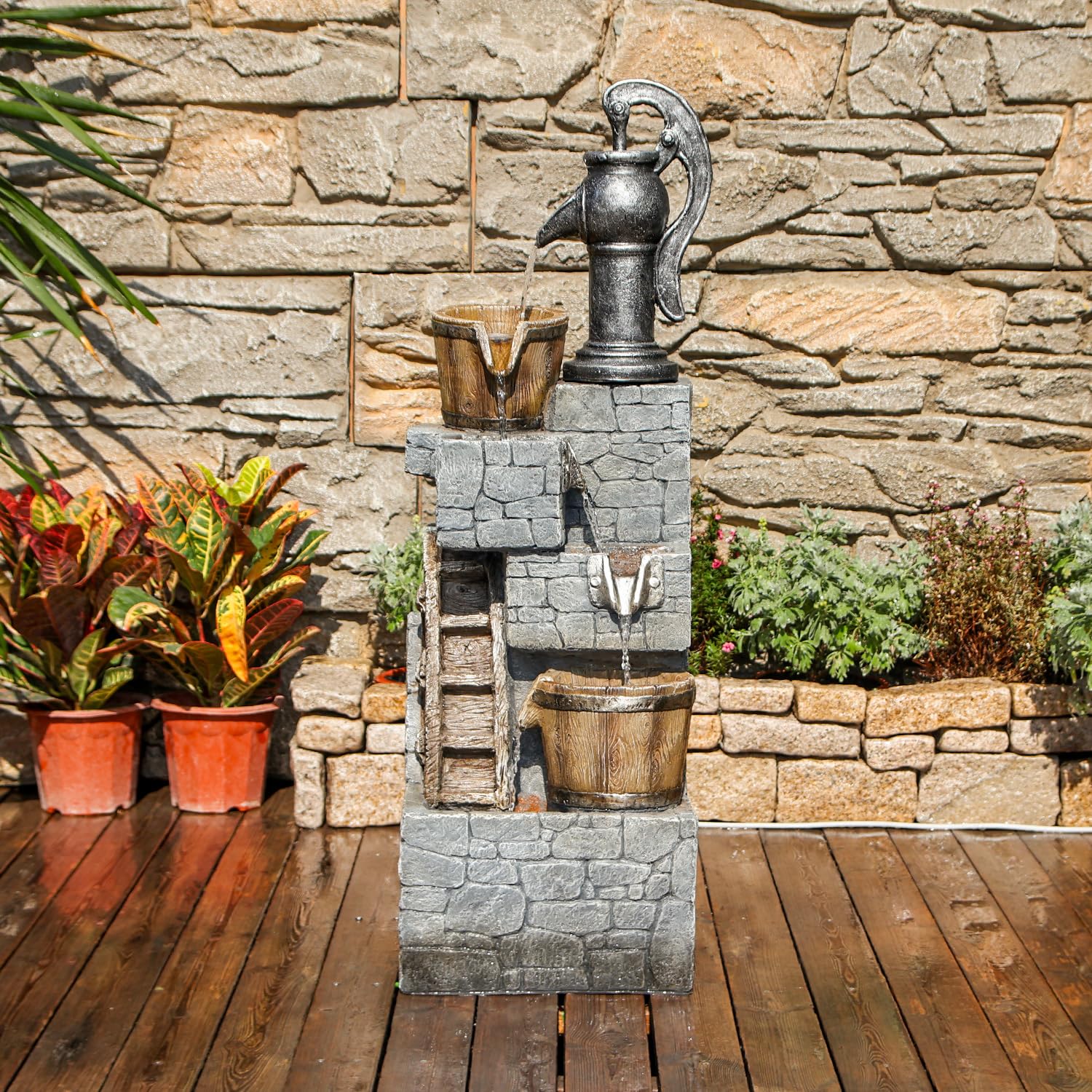 - A Focal Point for Outdoor Spaces: With its charming barrel, bucket, and hand pump design, YZM freestanding fountain creates a captivating centerpiece for your garden, backyard, or porch, making your outdoor space feel like home