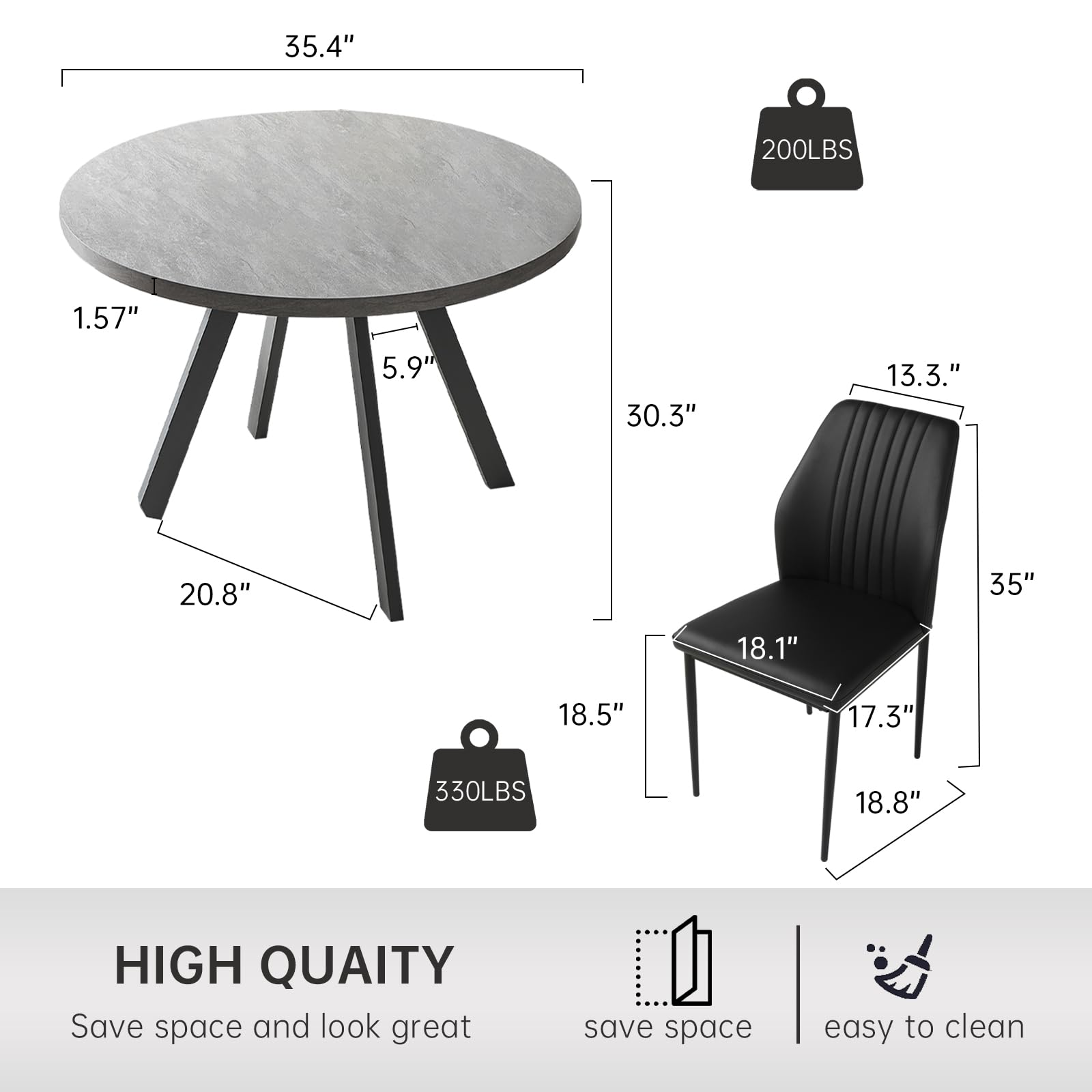 - Round Dining Table Set for 4 The round dining table set includes 1 dining table and 4 PU leather chairs. Round dining table maximises the dining area. Unique textured finish to match any style of home decor.