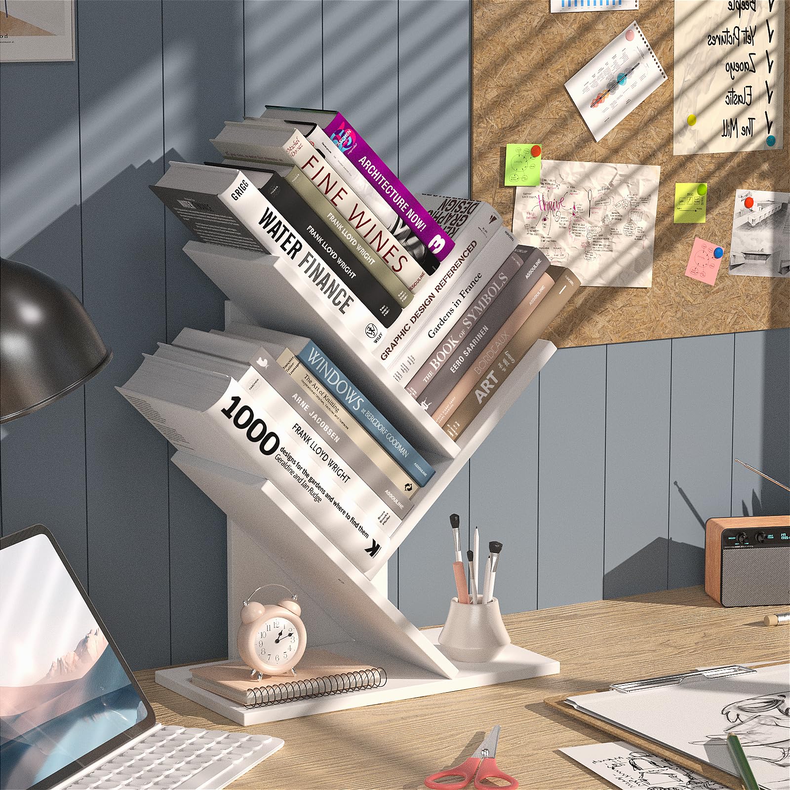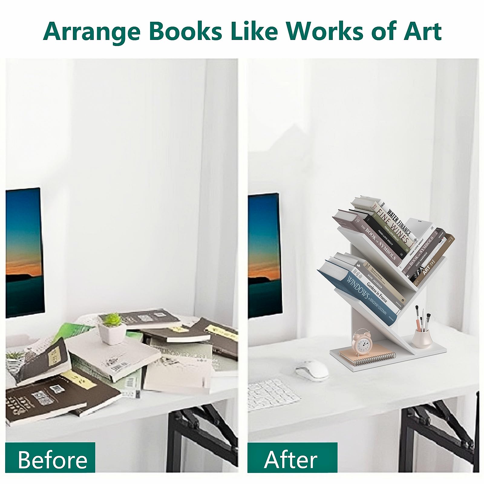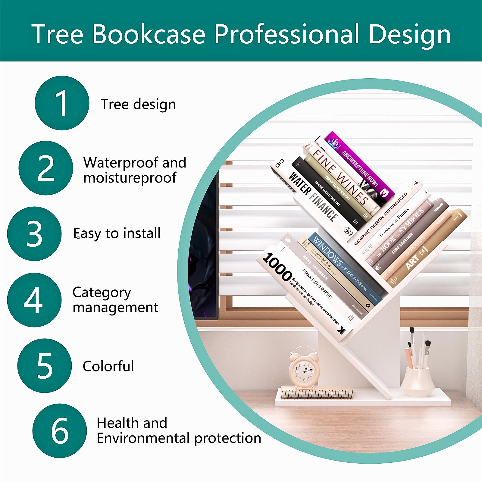 - 【Space Saving and Large Capacity】: Tree book shelf size: 15.21"H x 11.58"L x 5.97"W, this compact bookshelf is designed to fit seamlessly into small spaces. 5 panels and 4 shelves design, each shelf can be loaded with up to 5-12 books, perfect for storing books, plants ...... you can put all your treasures on it!