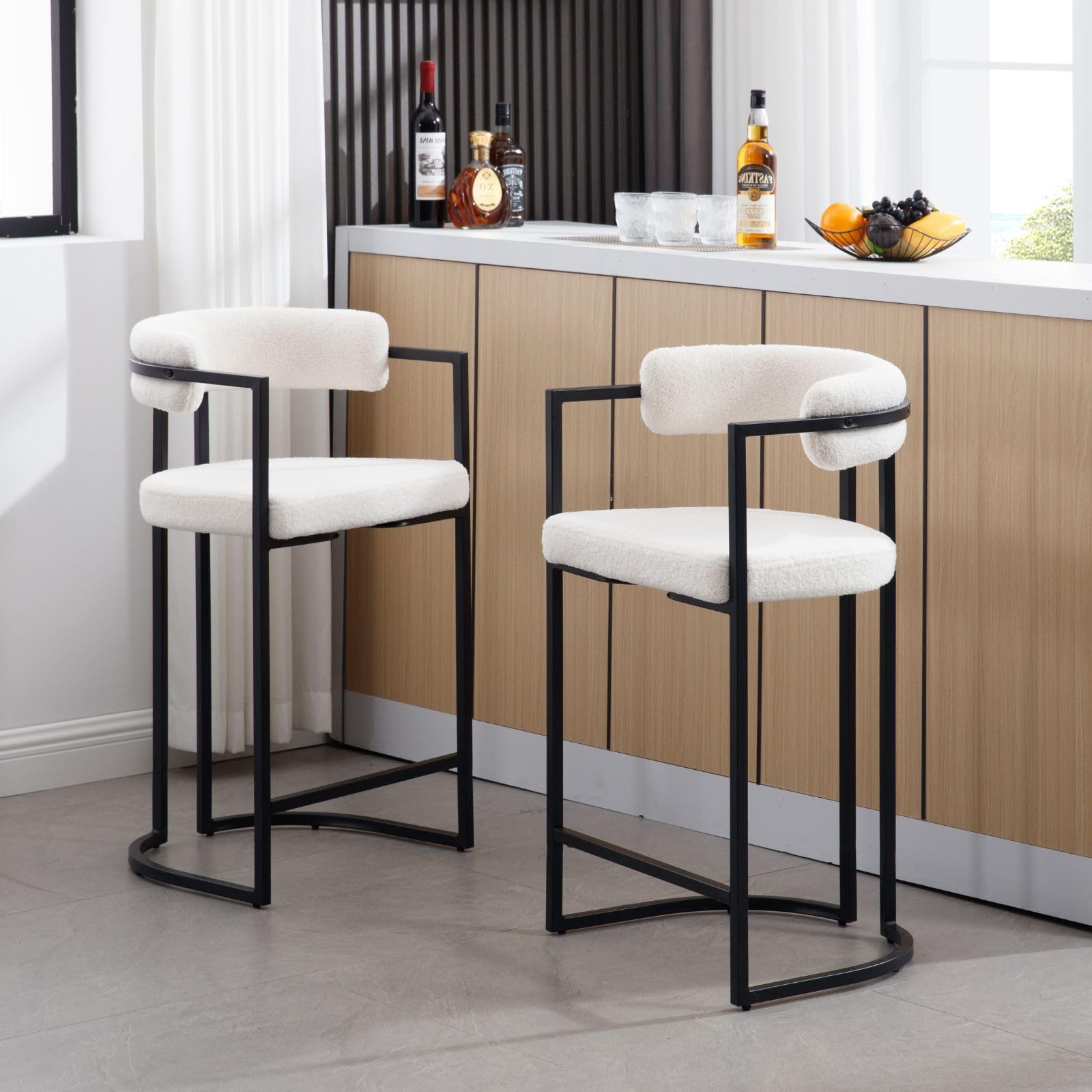 White Boucle Counter Height Bar Stools Set of 2, Modern 26 Inch Barrel Barstools