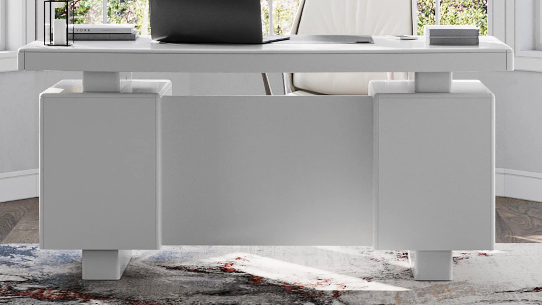 Monroe White Lacquer Modern Desk with Leather Pad and Storage